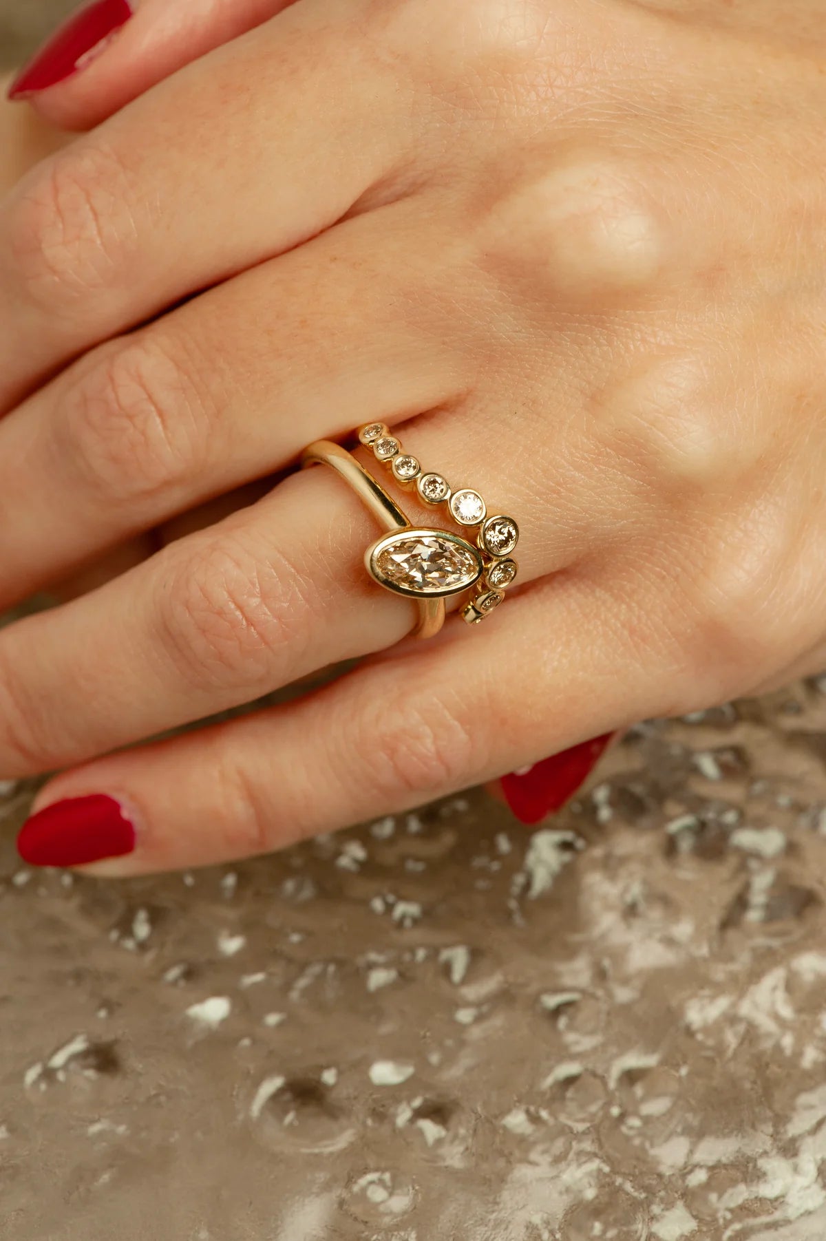 Bezel-set champagne diamonds trace a sleek, asymmetrical wave around the finger, creating a modern yet timeless silhouette. Striking alone or layered in a stack, the Aurora Ring embodies understated elegance. Perfect for a wedding, anniversary, or special milestone, it adds effortless luxury to any jewellery collection.