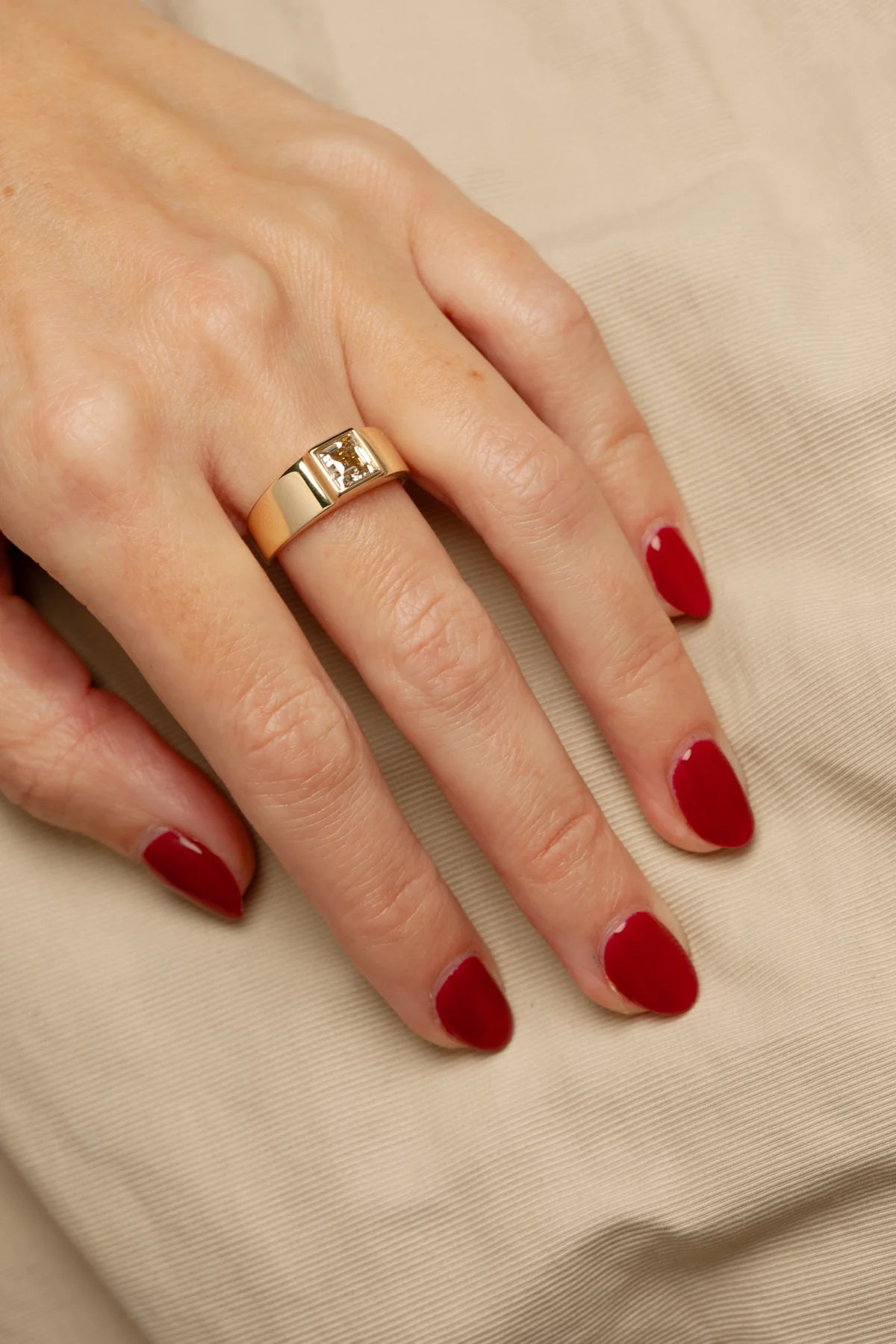 ATTIC’s Ellis Ring was designed to highlight the striking geometric beauty of this unique champagne Carré Step Cut diamond. A slim bezel emphasizes the stone’s clean lines, while a flat tapering band mirrors its sharp symmetry. A versatile design, perfect for everyday wear or special occasions.