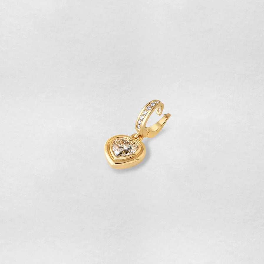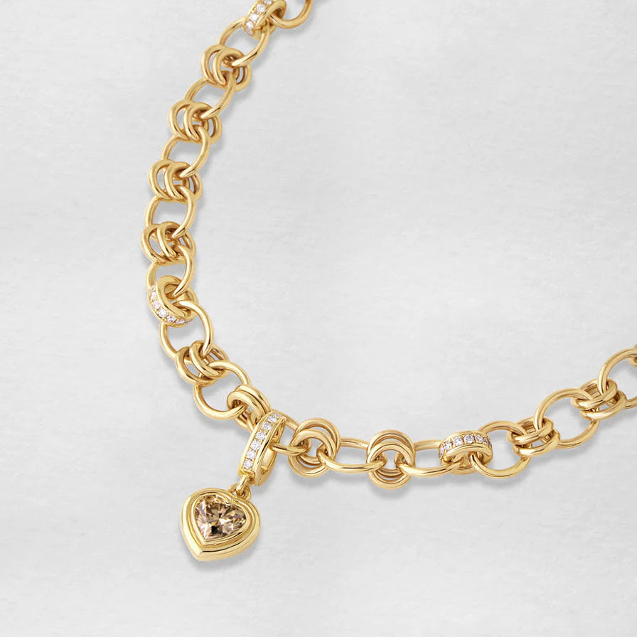 A warm champagne Heart Brilliant Cut diamond takes center stage, elegantly set in a generous bezel with a pavé-set bail. This rare pendant can be worn on any chain, though it pairs beautifully with our Memento Necklace — a handcrafted, heirloom-quality chain with each link meticulously formed, soldered, and polished in our Toronto studio. Six pavé-set round brilliant Canadian diamonds refine the design, creating a piece that embodies timeless elegance and exceptional craftsmanship.