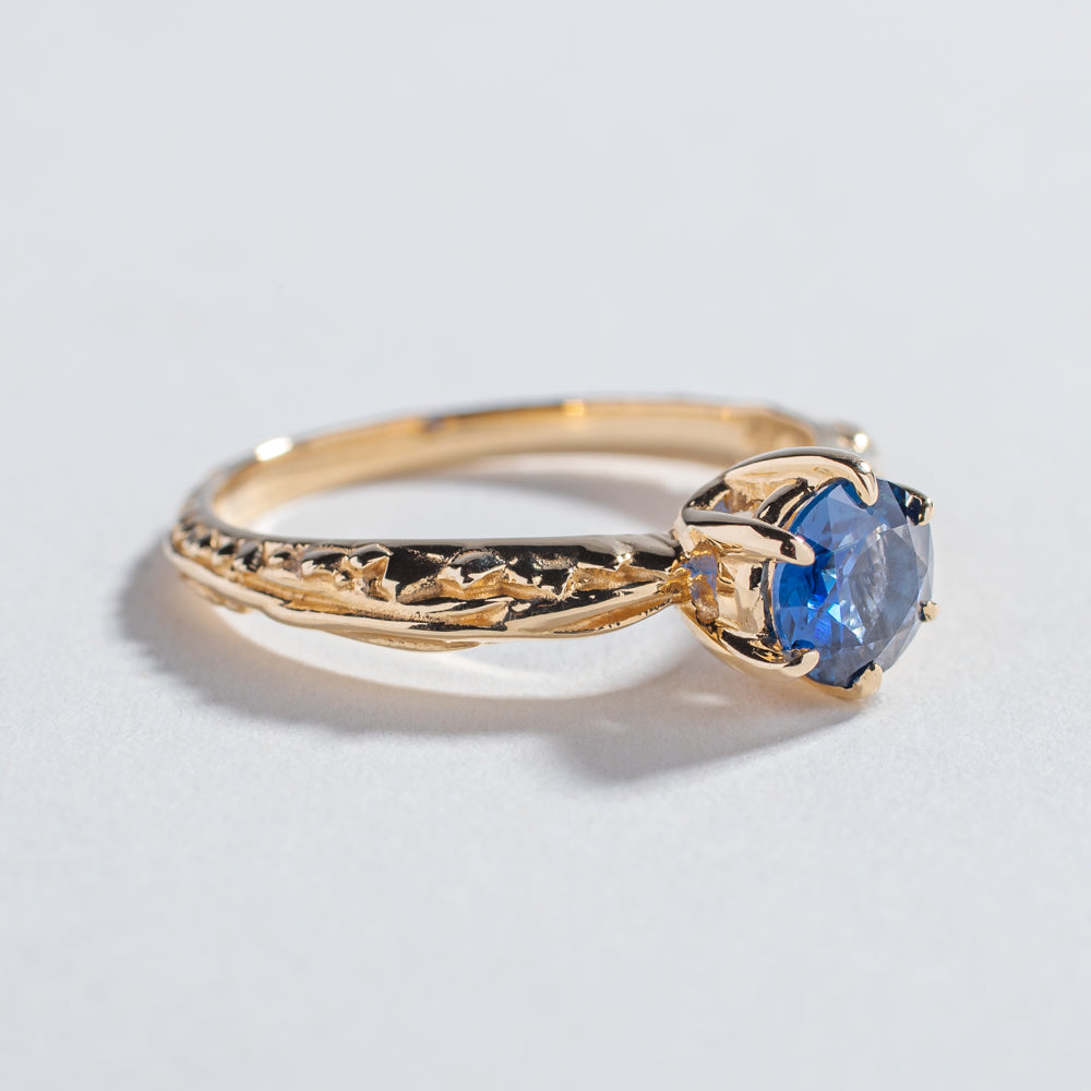 Our signature solitaire engagement ring with our exclusive crystalline and roots texture along the band. Sits high enough to make an impact of sparkle while still being comfortable for every day wear. Stacks perfectly with the Pave matrix contour band.