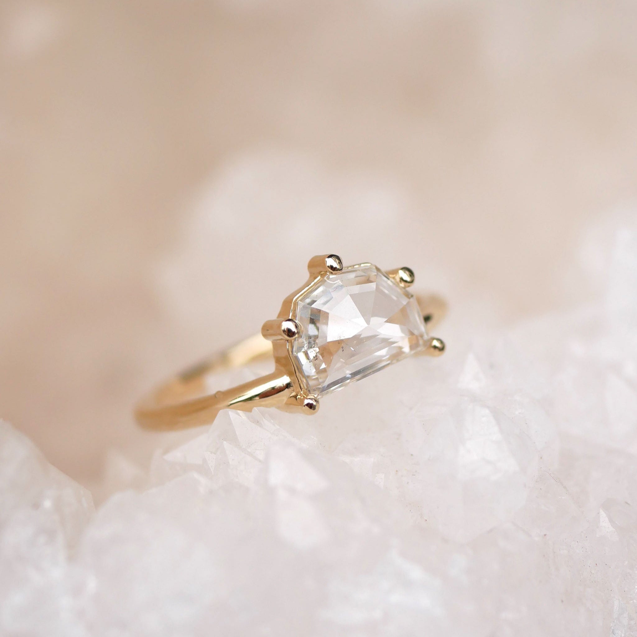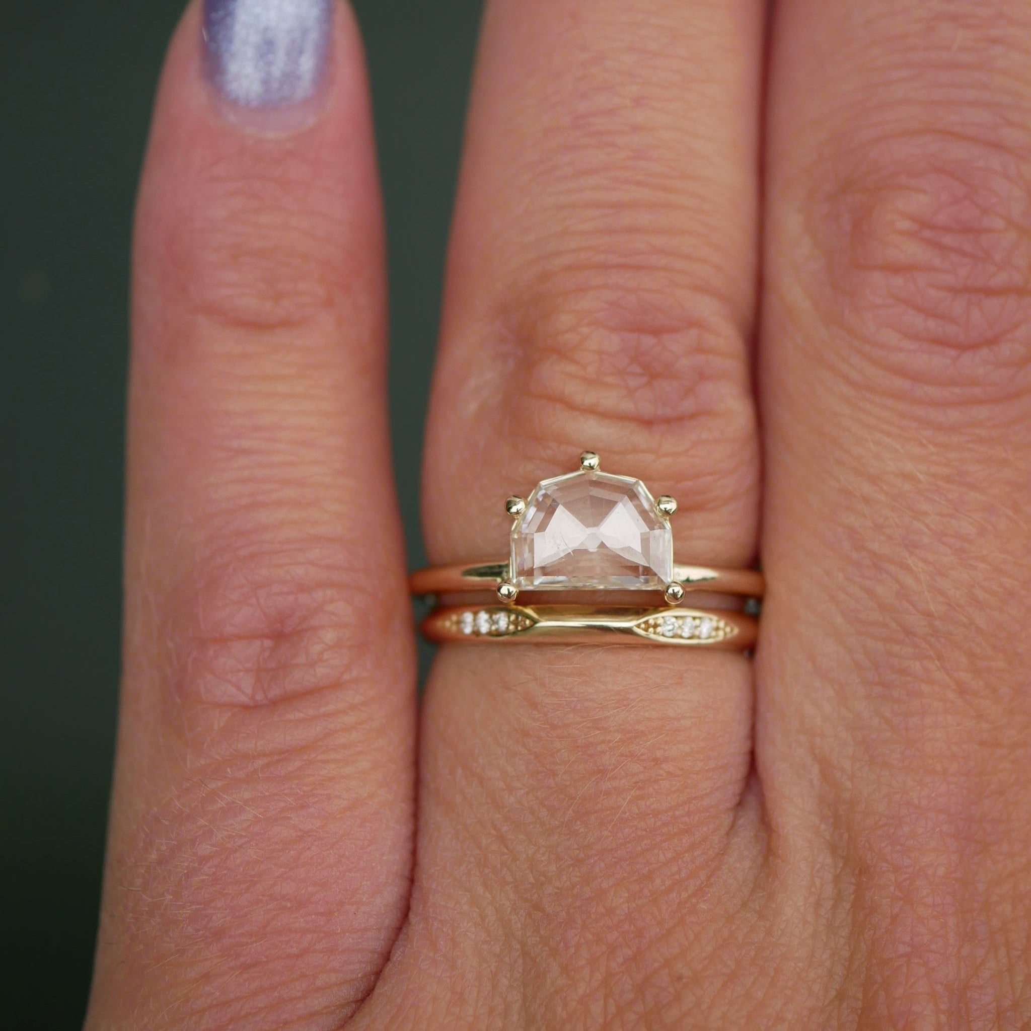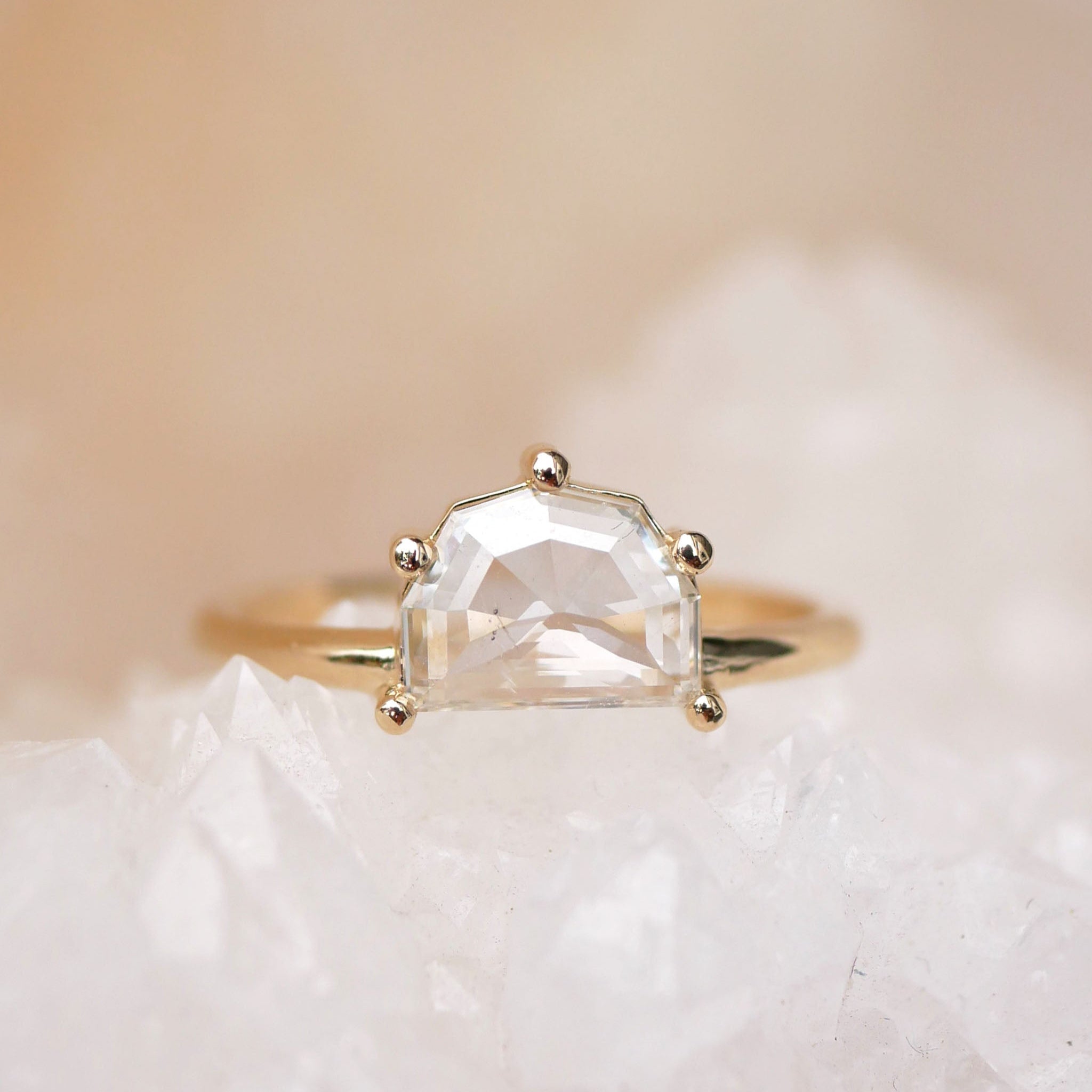 One of a kind 1.01ct rosecut geometric halfmoon white diamond in a 14k yellow gold prong setting. This piece is one of a kind due to the unique center diamond.
