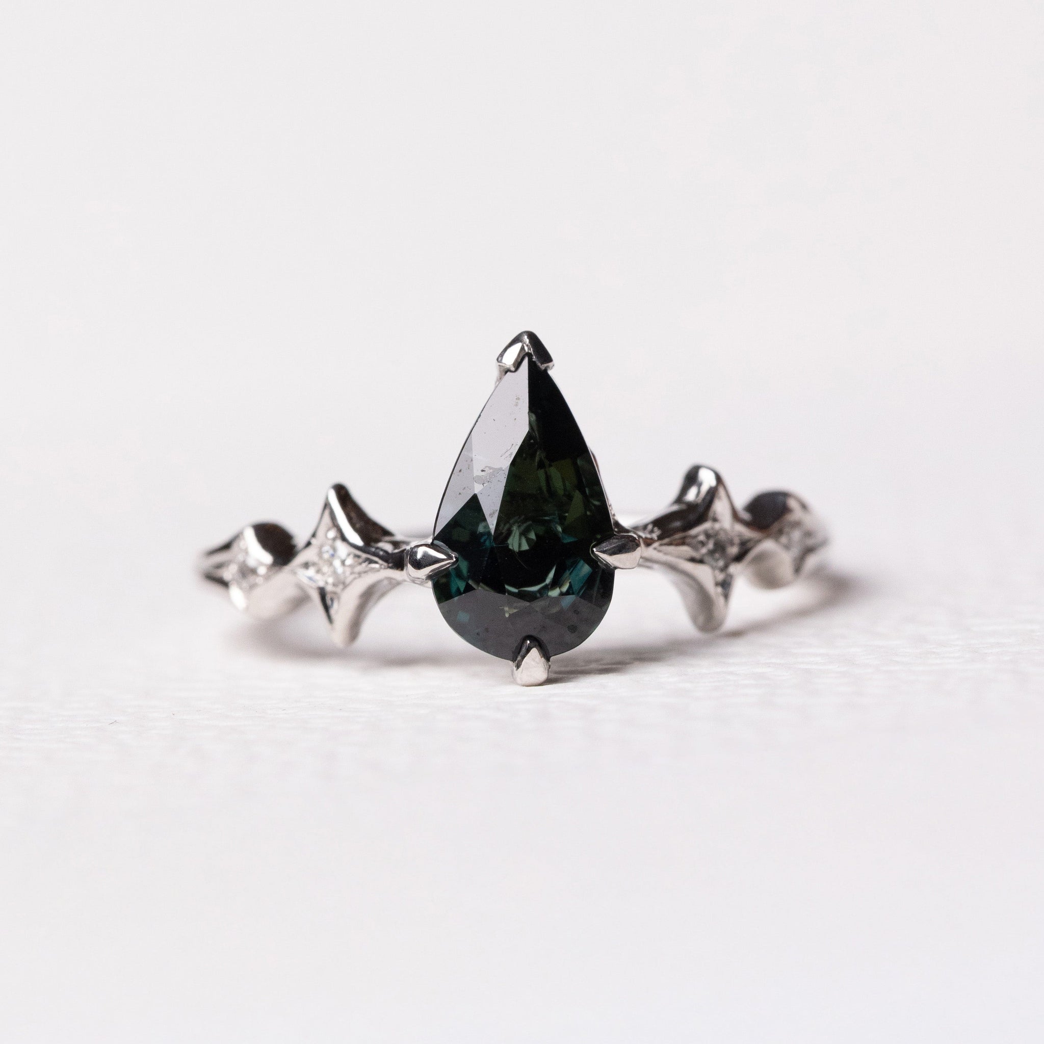 The pear-shaped sapphire, in a deep dark teal, glows with a quiet, graceful confidence. Neither too large nor too small, it carries perfect balance — a gem that feels personal, like a secret of calm beauty resting against the skin.