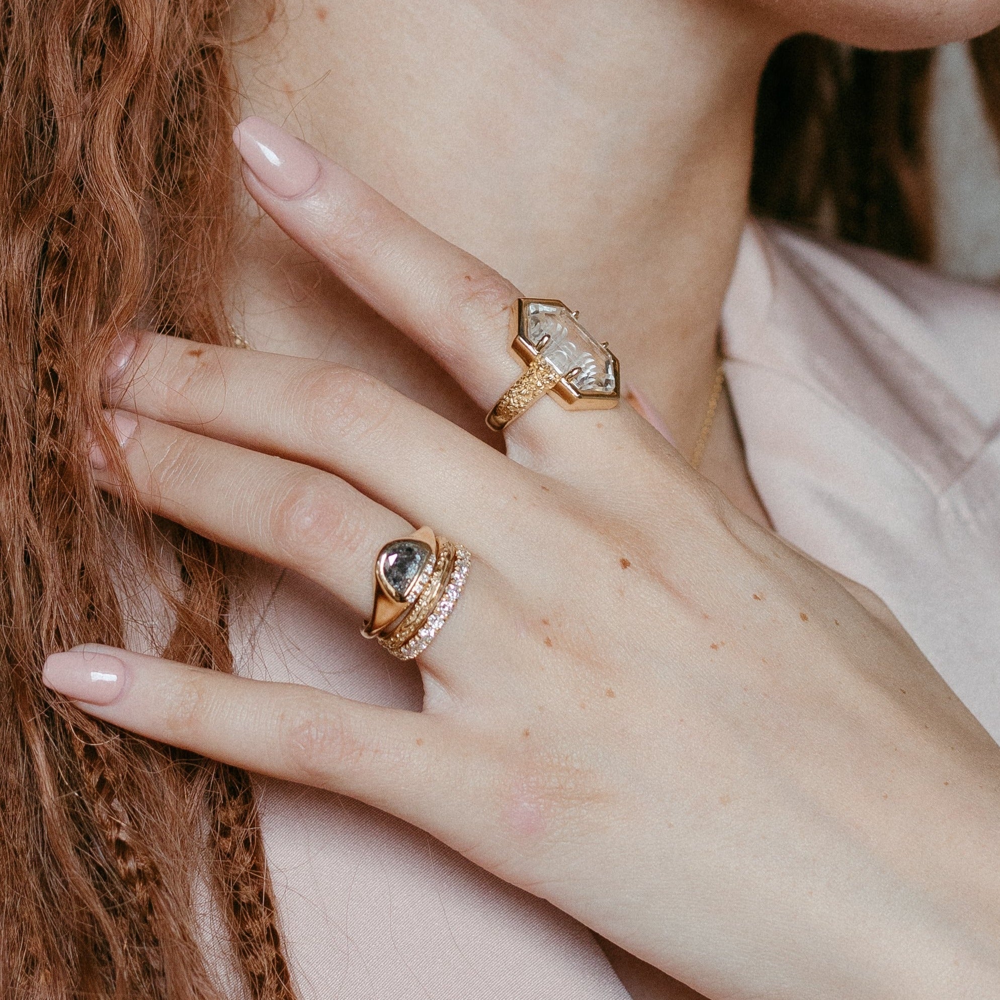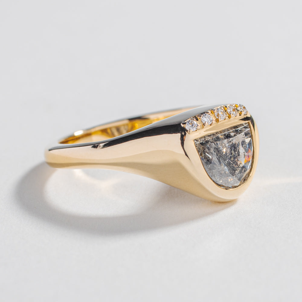 Angela Monaco's Luna Ring shines in all its splendor with a half-moon salt and pepper diamond, laced with five petite white diamonds, and cast in solid 14K yellow gold. This signet-style engagement ring is a first of its kind in the Angela Monaco Jewelry design vault. Perfect for someone who likes the feel and look of something heartier and bolder.