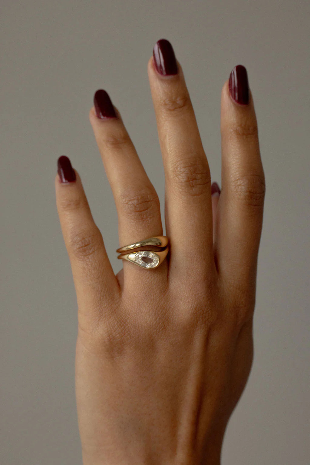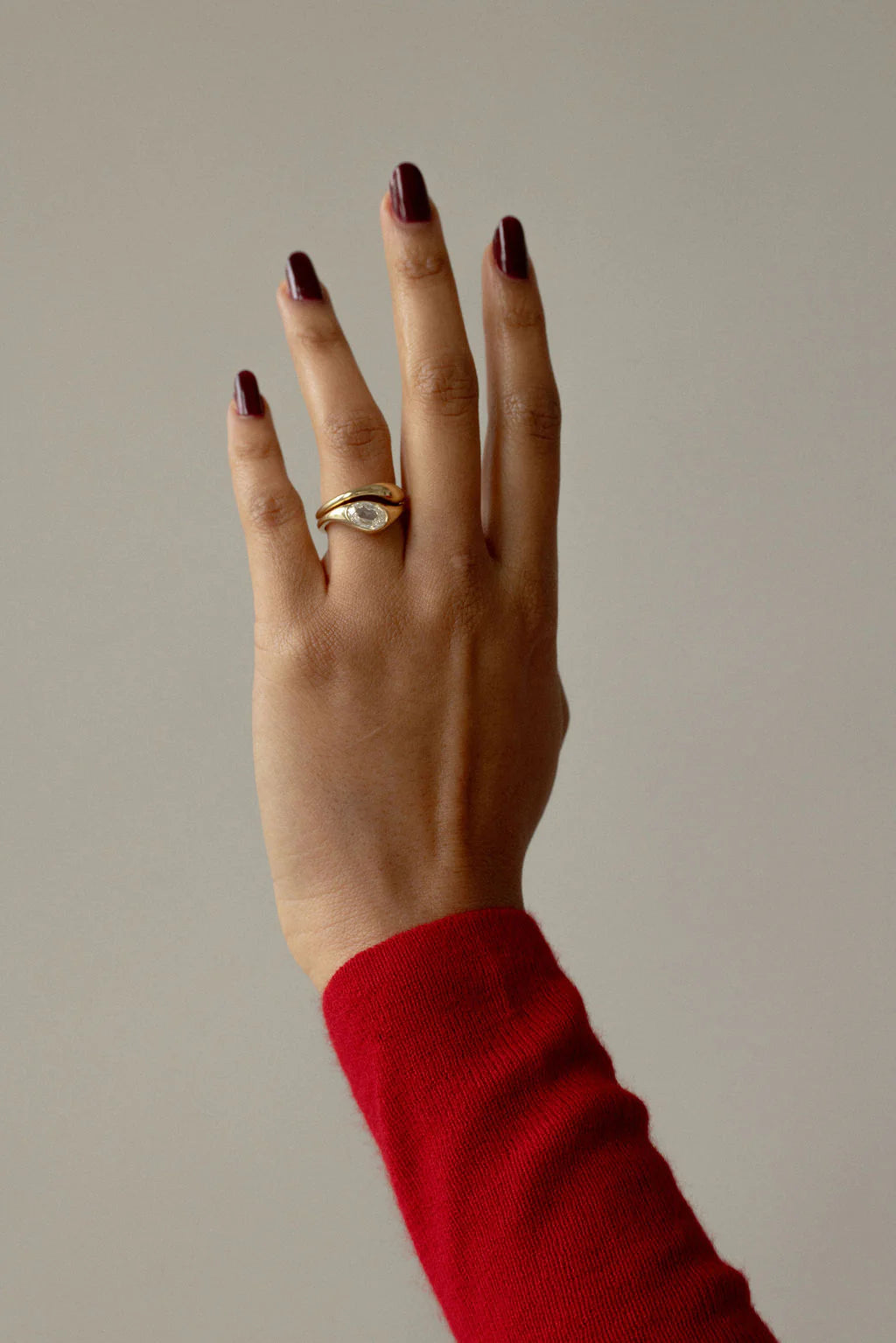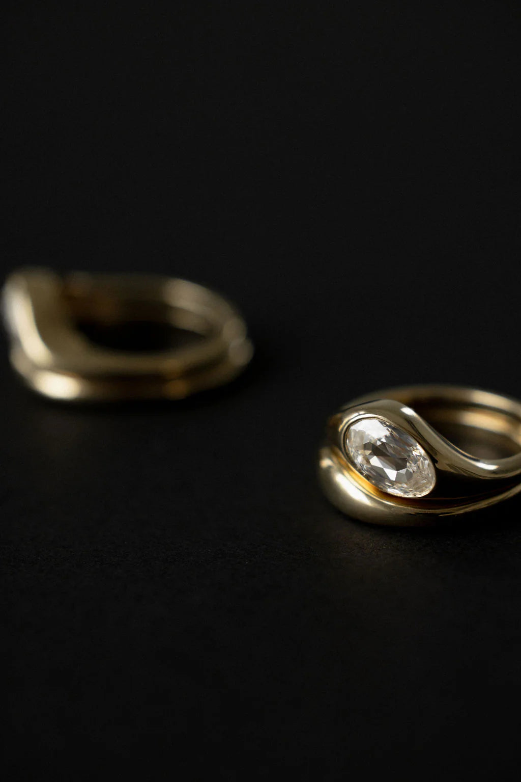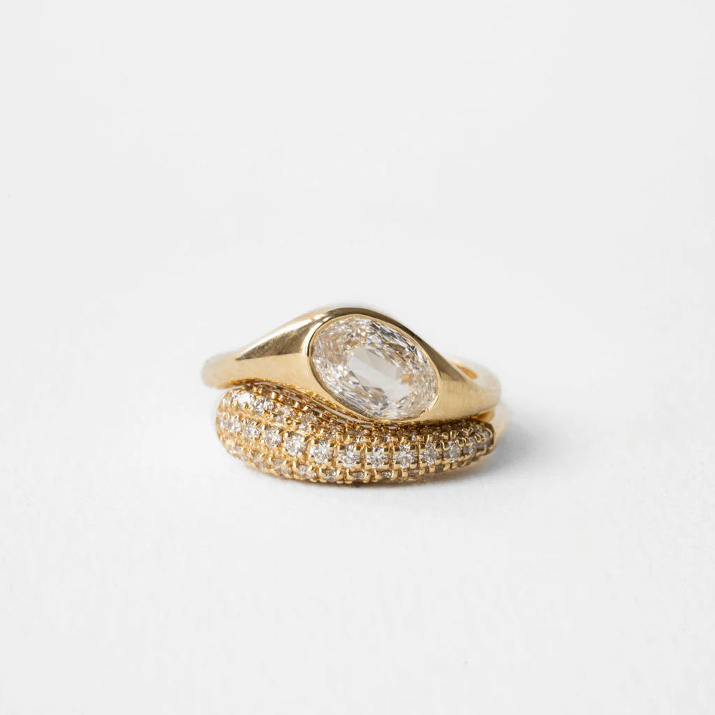 Marlow is an iconic duo. A flush set east-west antique cut oval diamond adorns its chunky domed band designed with a matching gold stacker.