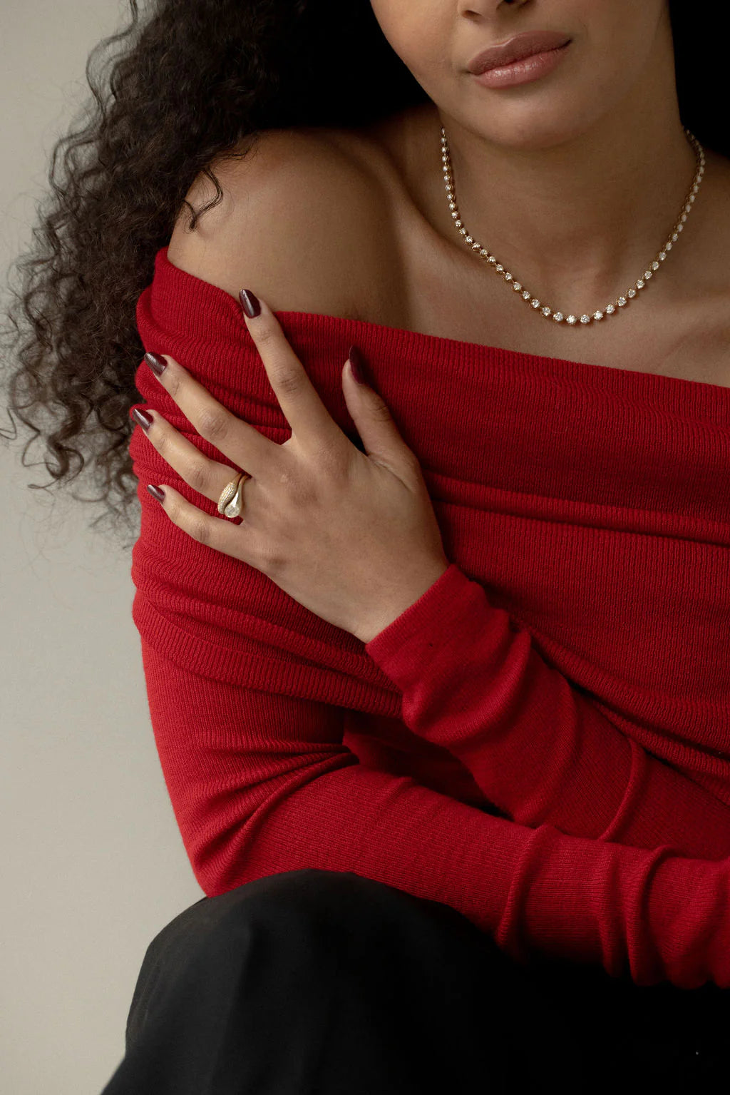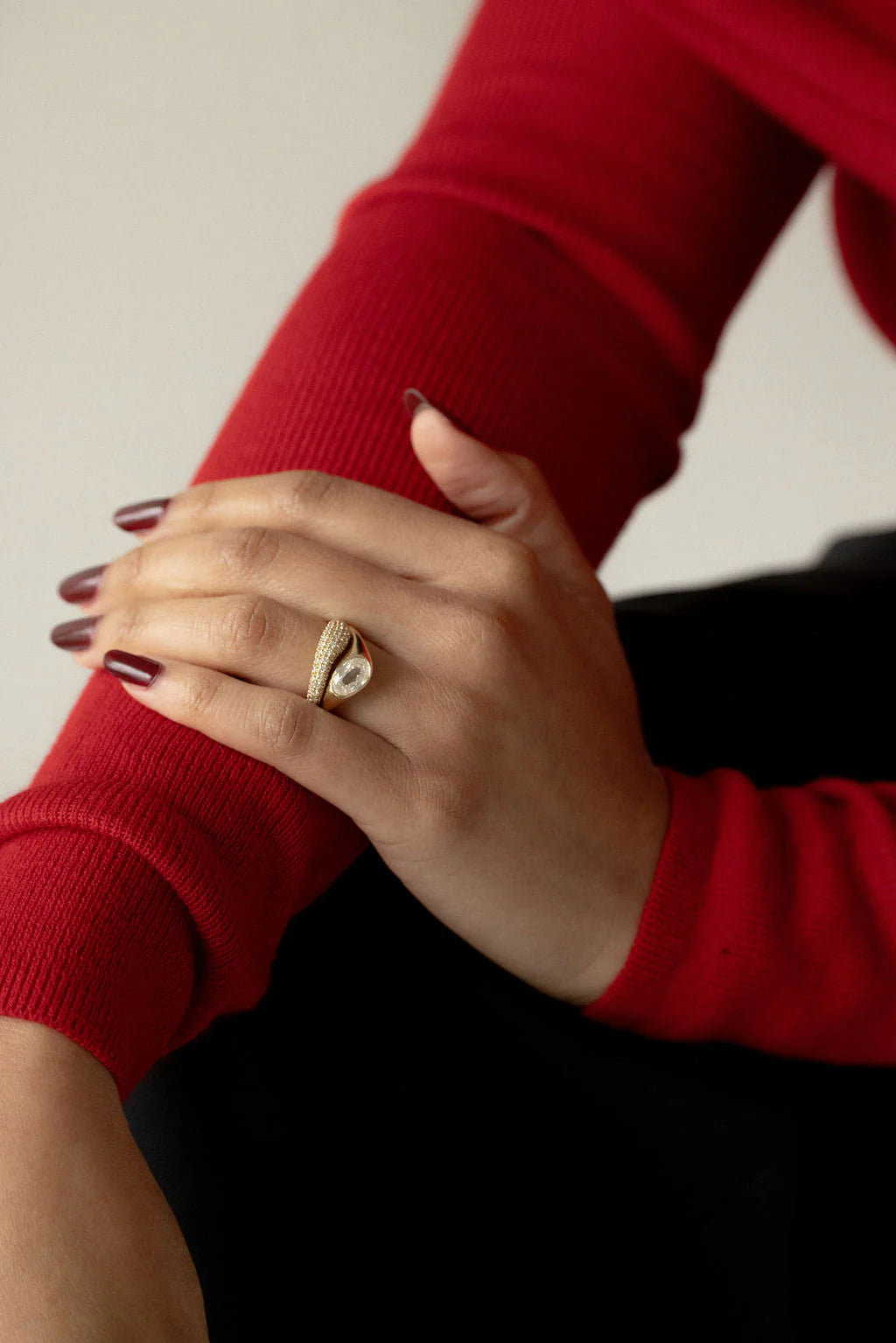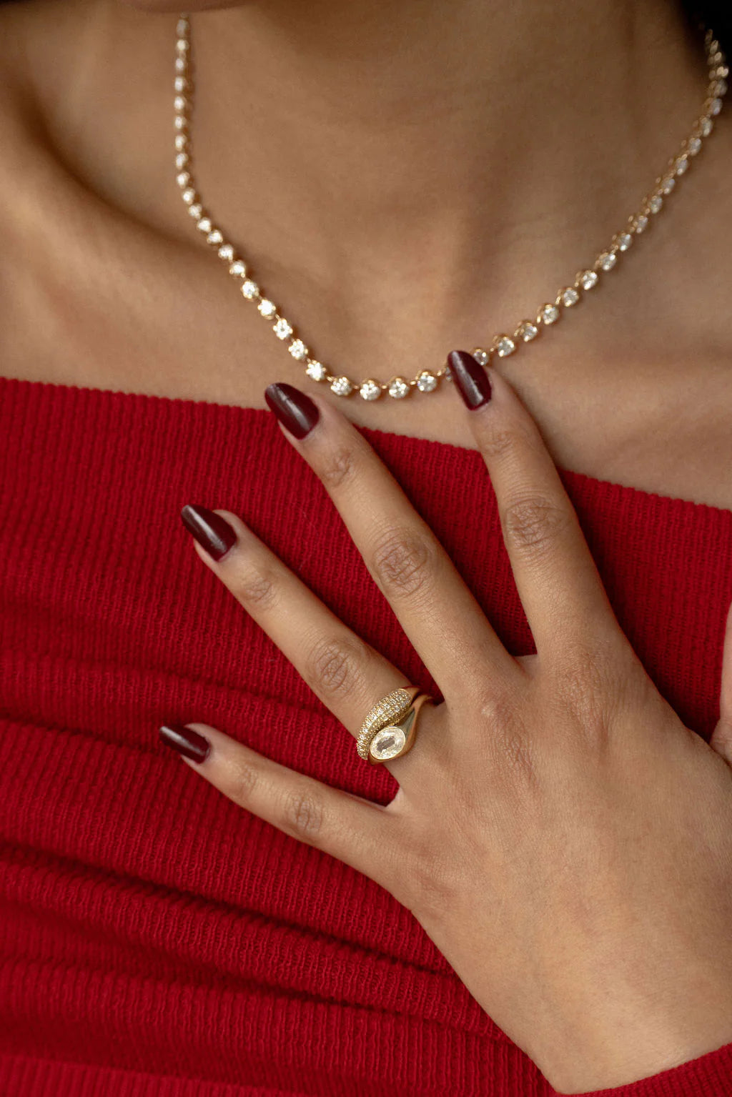 Marlow is an iconic duo. A flush set east-west antique cut oval diamond adorns its chunky domed band designed with a matching gold stacker.