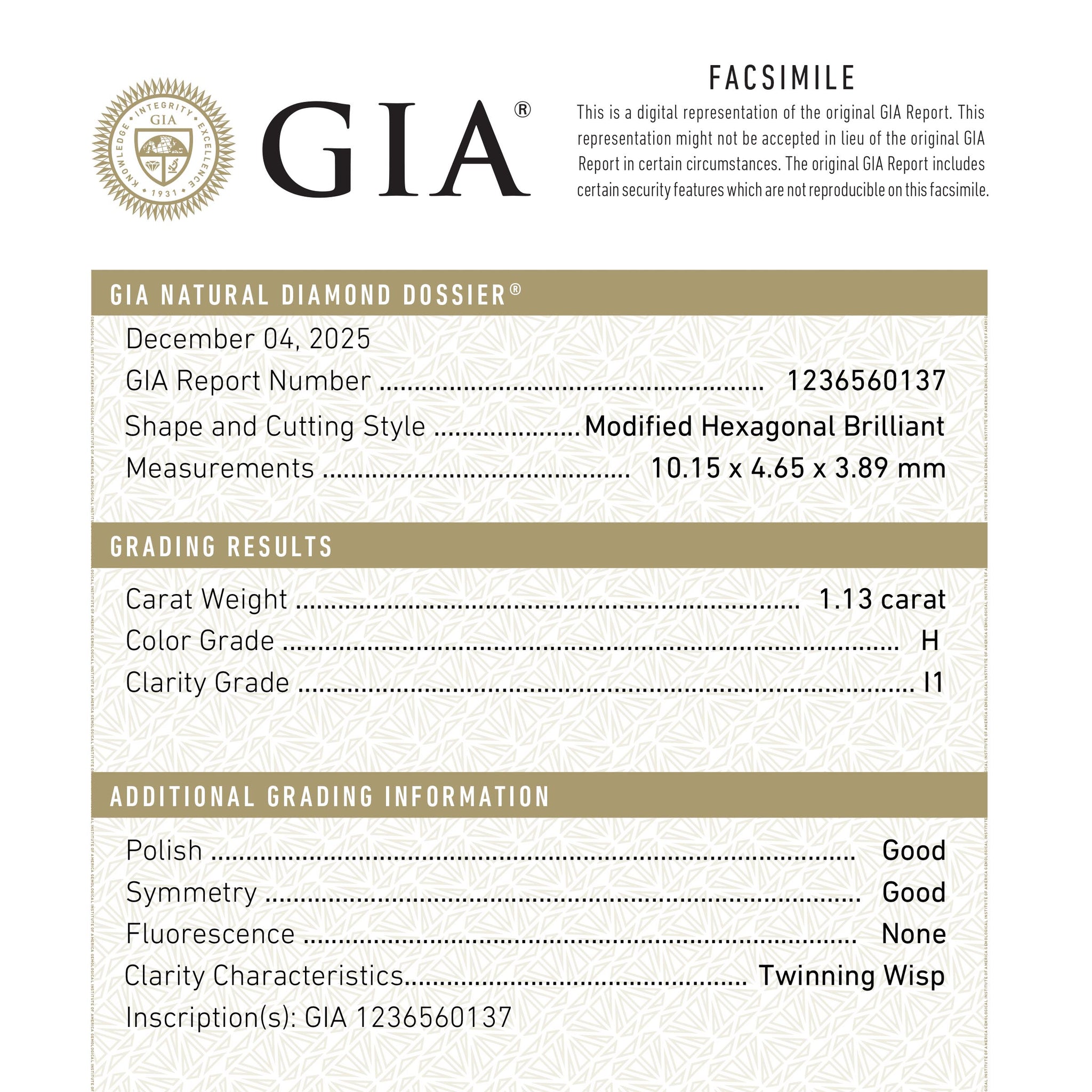 1.13ct 10.15x4.65x3.89mm GIA H I1 Hexagon Brilliant 27391-01