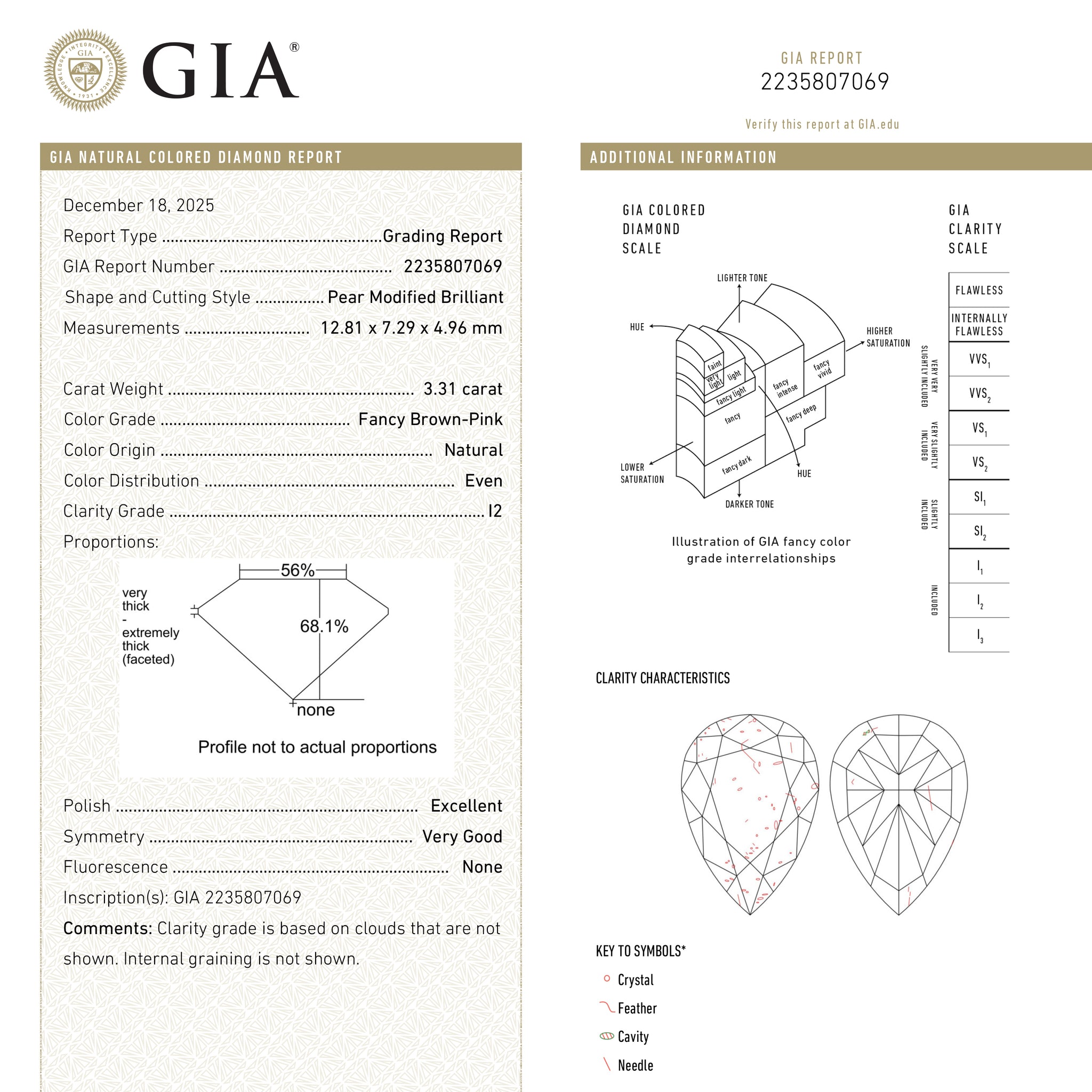 3.31ct 12.81x7.29x4.96mm GIA Fancy Brown-Pink Pear Brilliant 27233-01