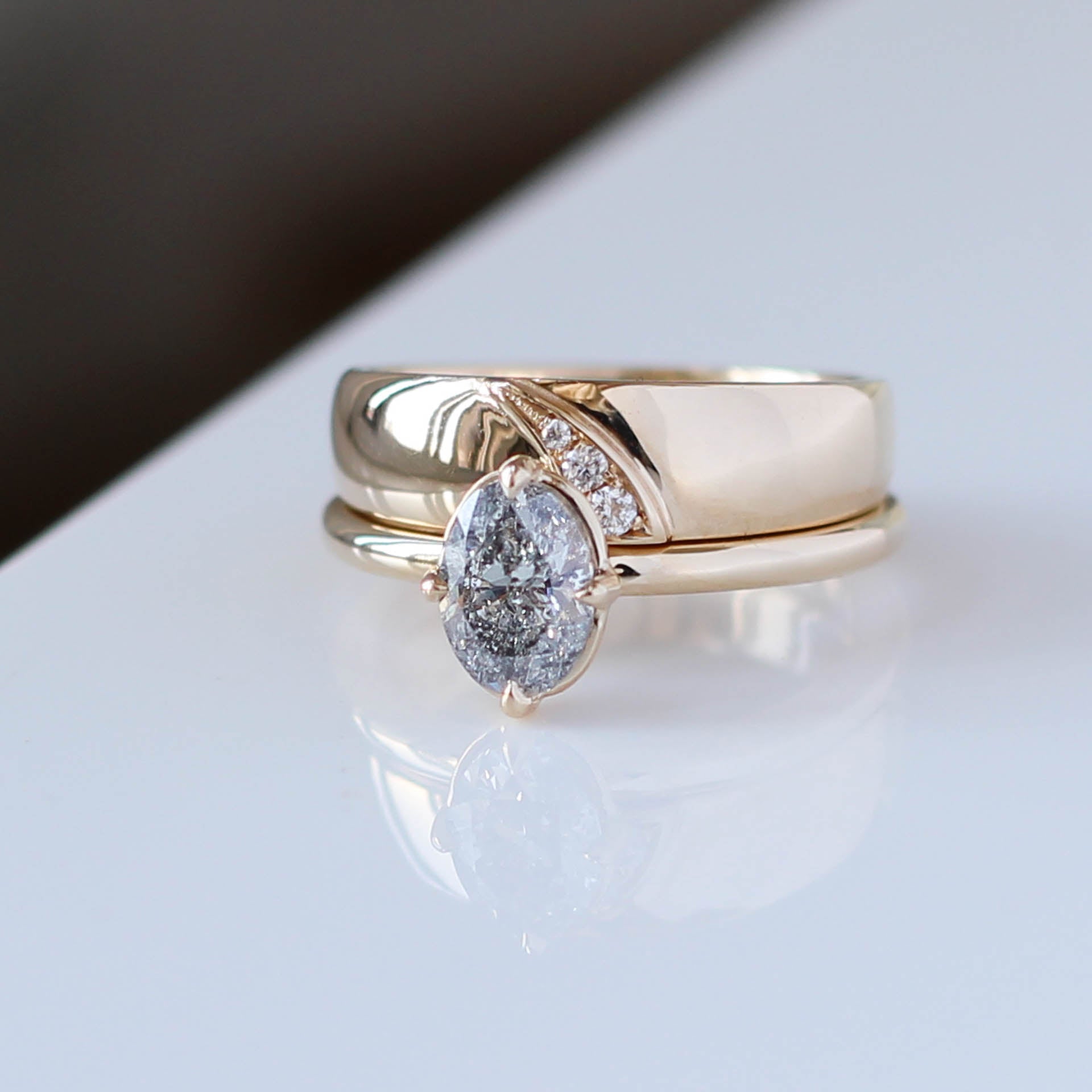 Our Around The World ring embodies the thrill of life's adventure and our deep passion for voyaging. An absolute classic engagement ring solitaire style with a one of a kind oval salt and pepper diamond that glows. Set in our signature compass 4-prong setting. The diamond, carefully selected for its exquisite brilliance and unique nature, is truly unforgettable. The elegant smooth band is made with the raised setting to perfectly accommodate curved or flush bands for a flawless fit.
