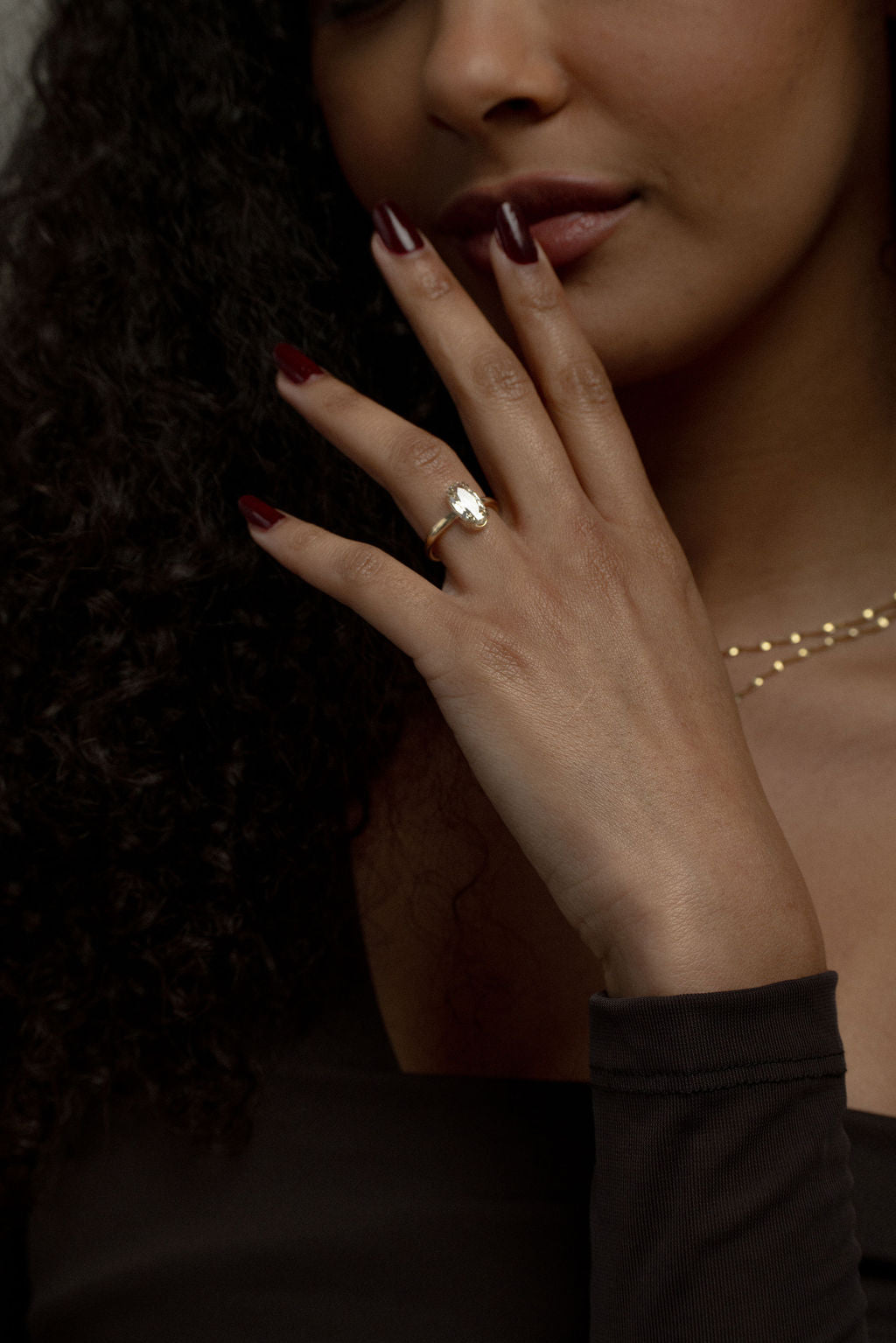 A vintage style treasure. With facets designed to resemble delicate flower petals, this rare design features a rose cut moval natural champagne diamond center.