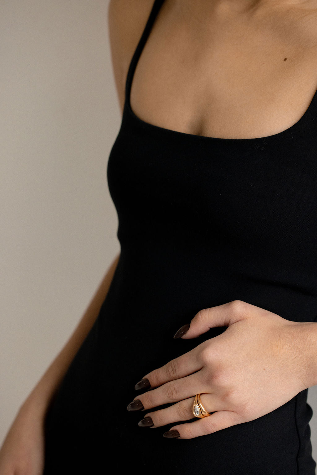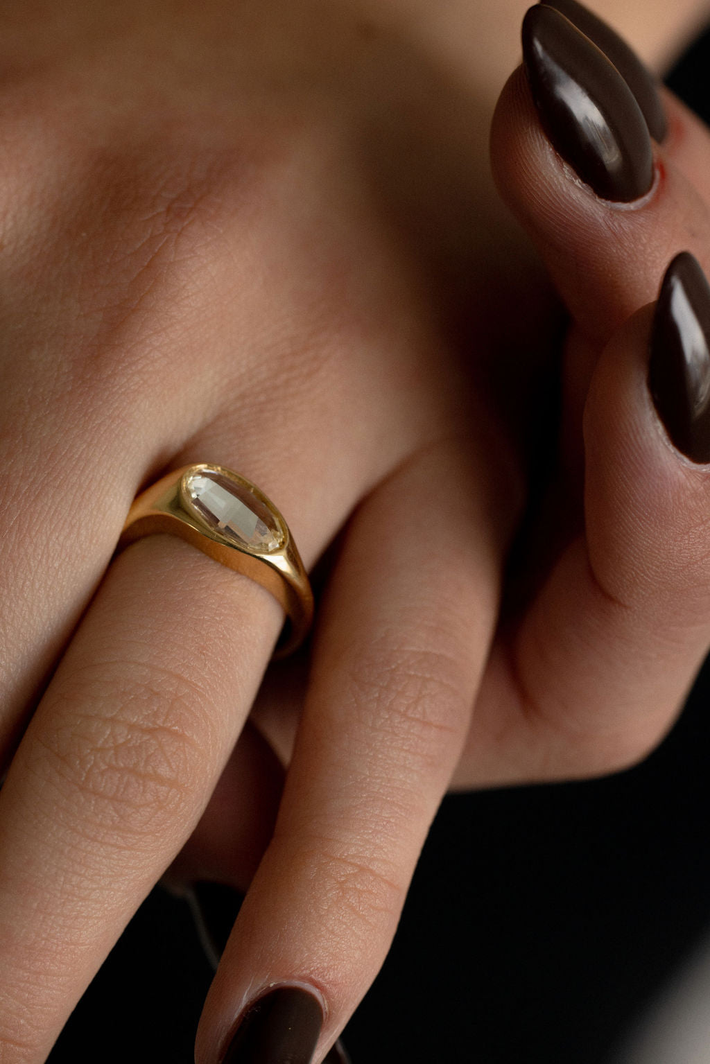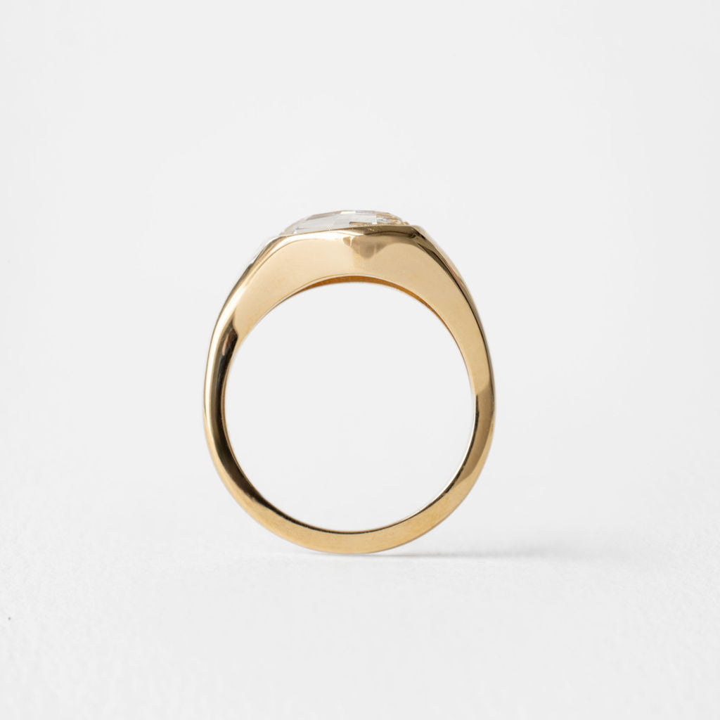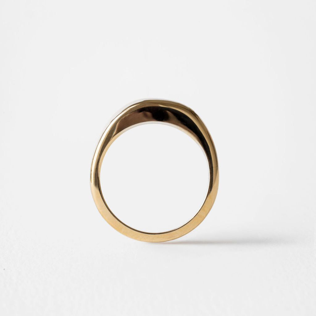 Marlow is an iconic duo. A flush set east-west antique cut oval diamond adorns its chunky domed band designed with a matching gold stacker.