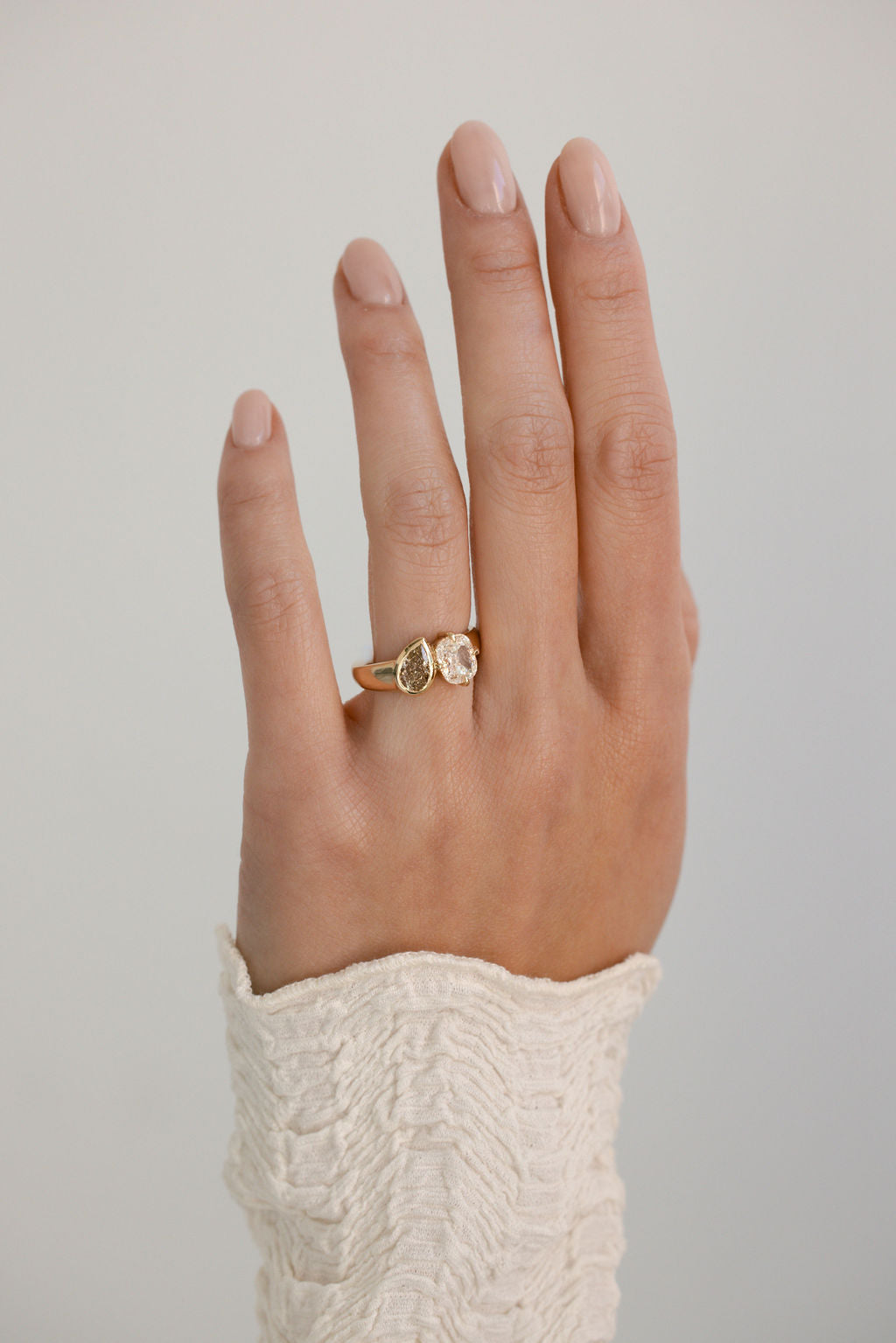 A dynamic duo to symbolize love and partnership. This rare design features a champagne pear diamond bezel set alongside a white elongated old mine cushion diamond.