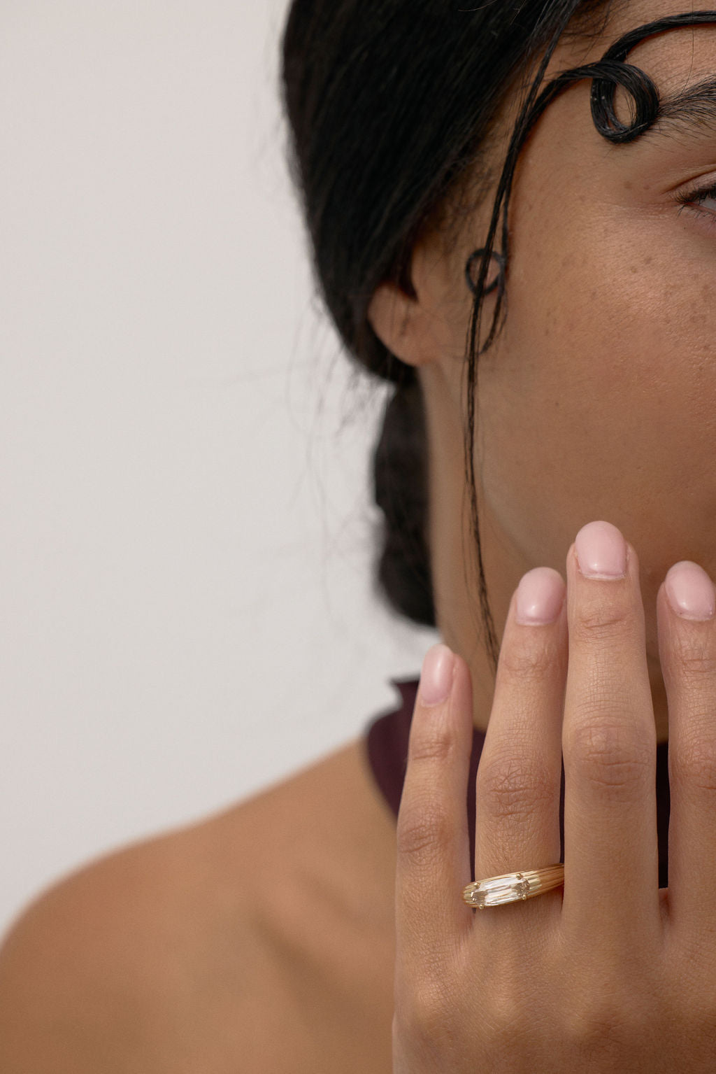 A fresh rendition of our Juno ring. A chunky domed band with ridged detailing secures its antique cut champagne moval center stone.
