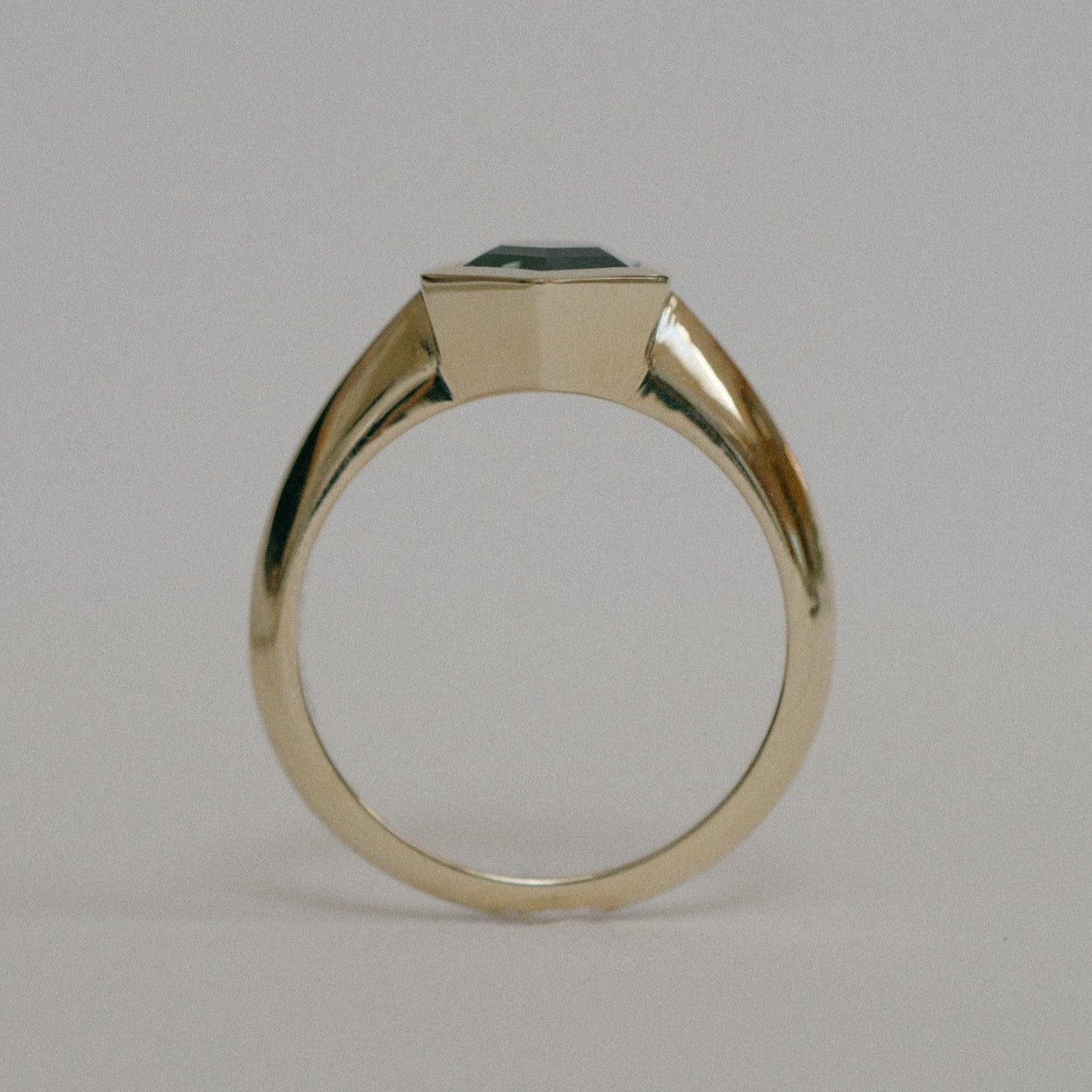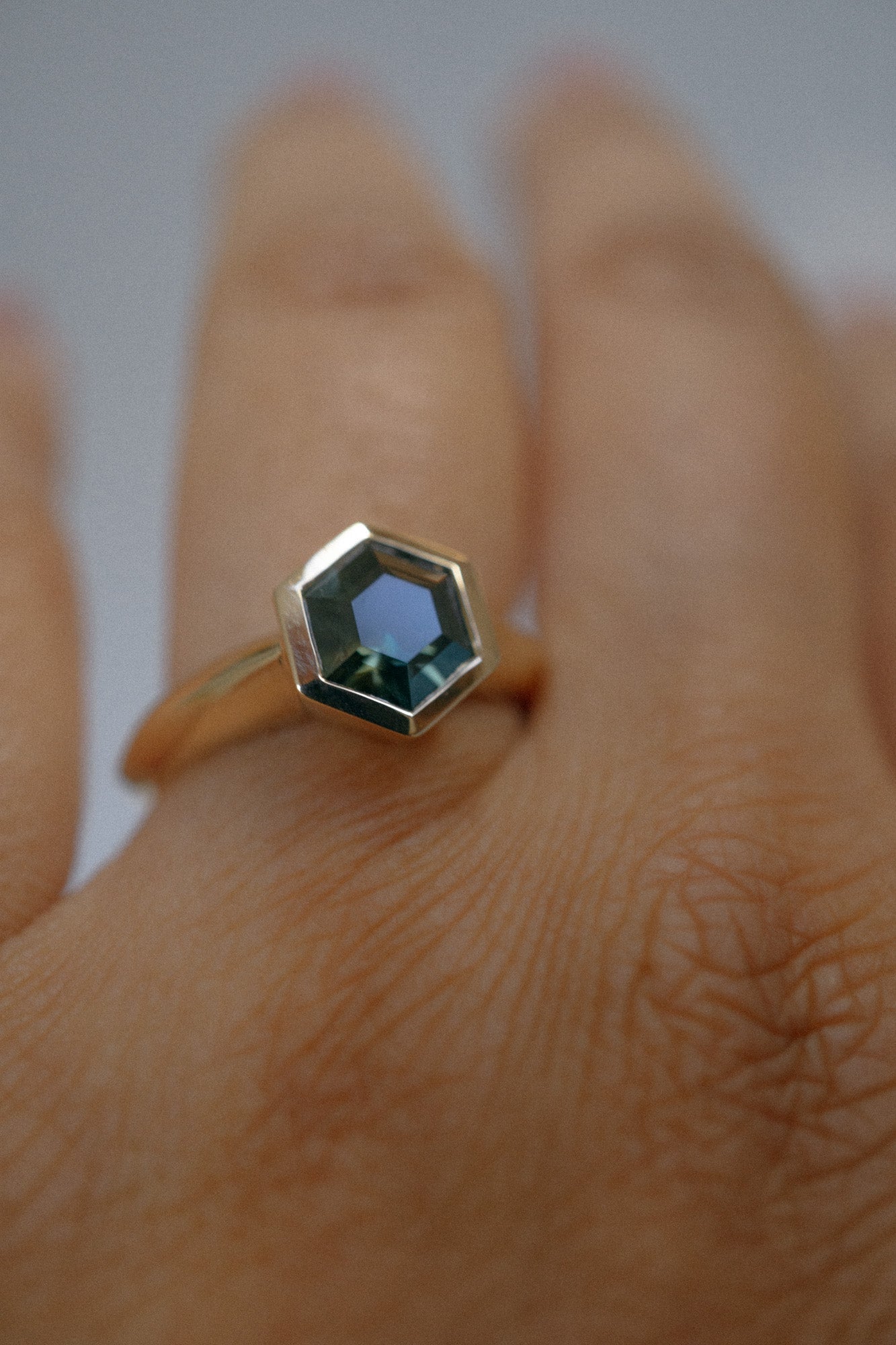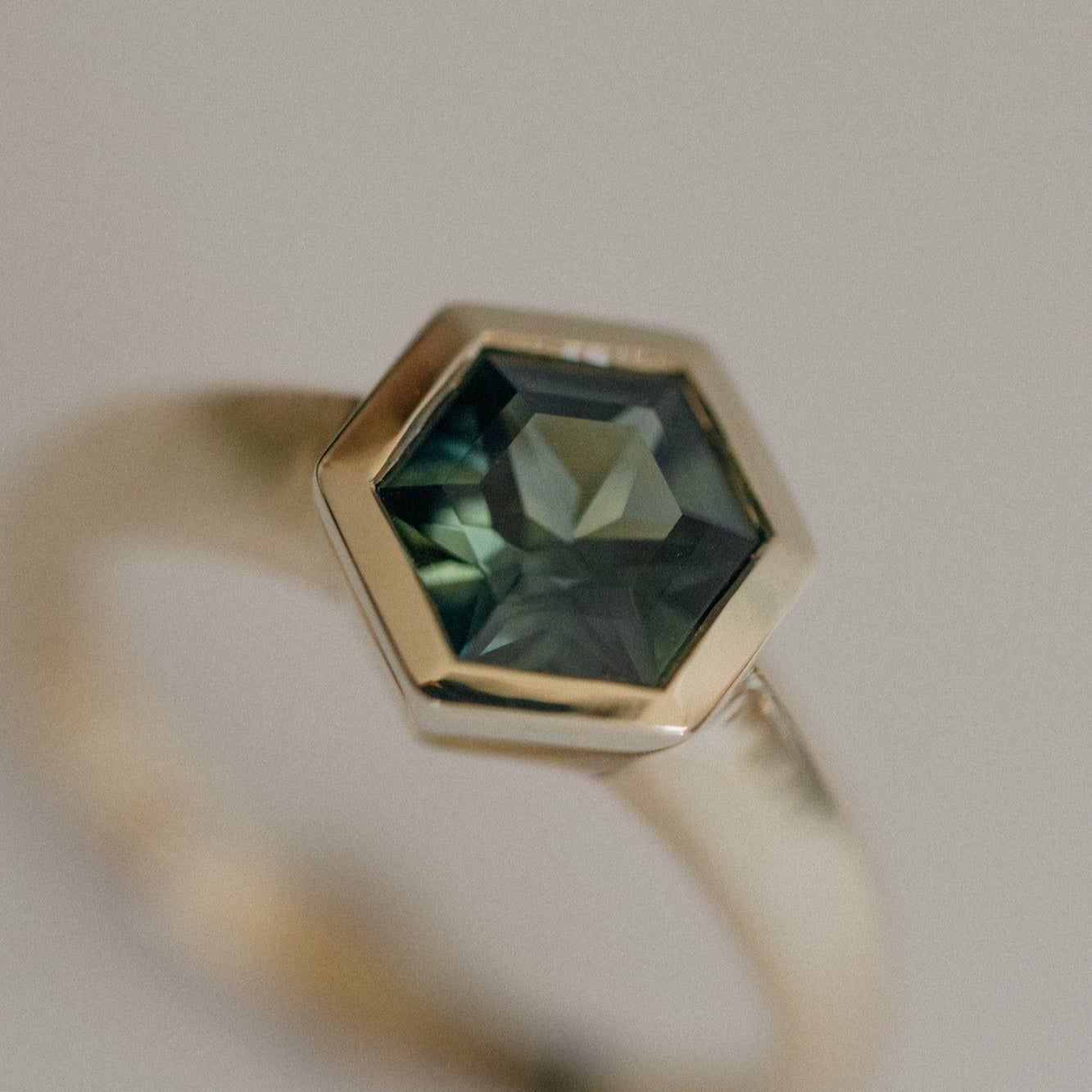Bring the night sky wherever you go. The Jupiter Ring holds a natural green hexagon brilliant-cut Australian sapphire center stone with a raised bezel setting. A true showstopper. Currently a size 7, but resizable--email us your size after you purchase it online. Only one and ready to ship!