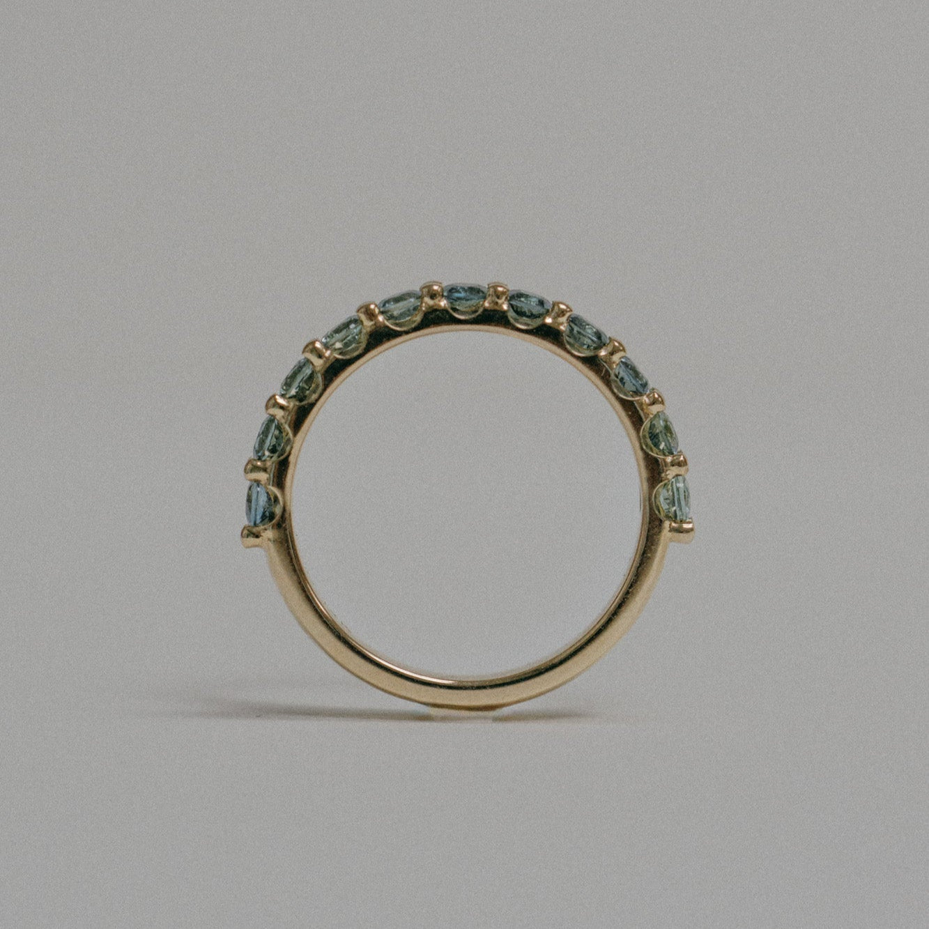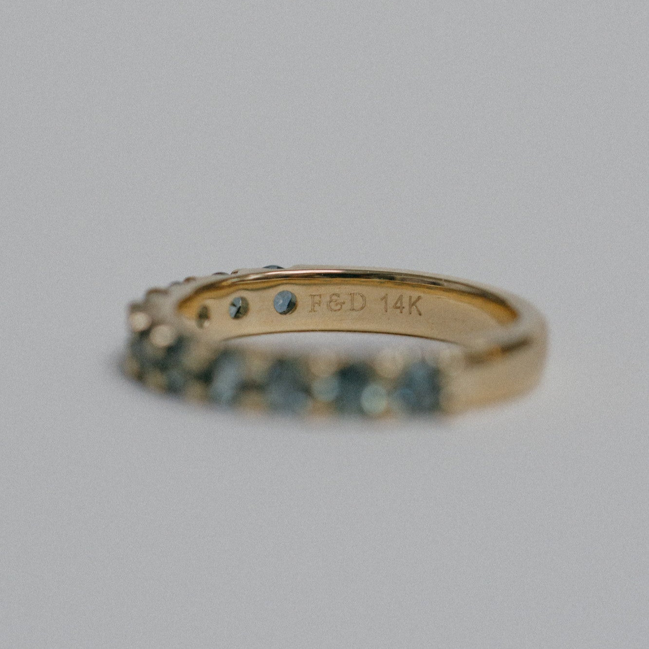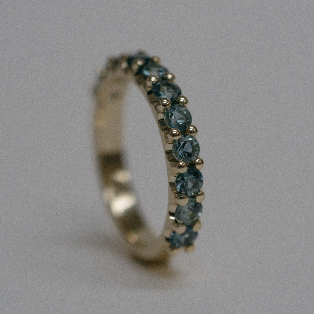 Sparkling like a babbling brook. A twist on our classic Leilah Ring, highlighting 11x conflict-free brilliant montana sapphires in a sparkling pave setting. Each sapphire is hand-picked by our team. A perfect ring on its own styled as a stacking ring, engagement ring, or wedding band. Stacks beautifully with the Villa engagement ring. Currently a size 7, but resizable--email us your size after you purchase it online.