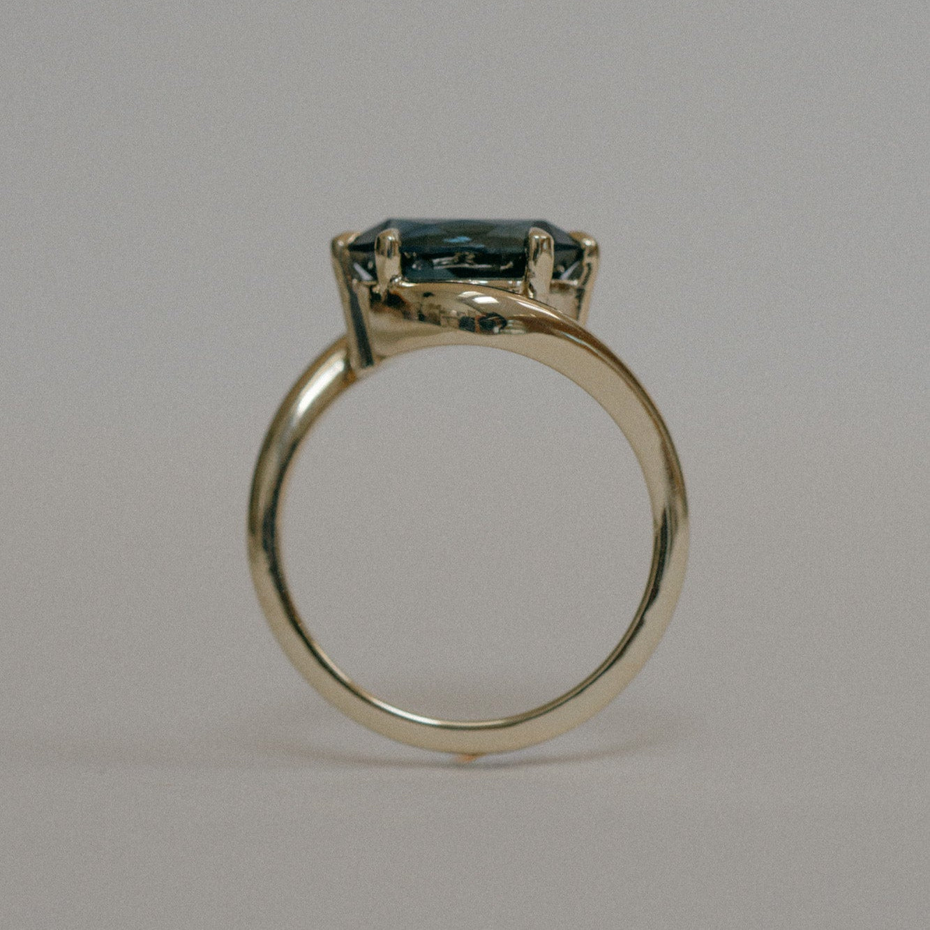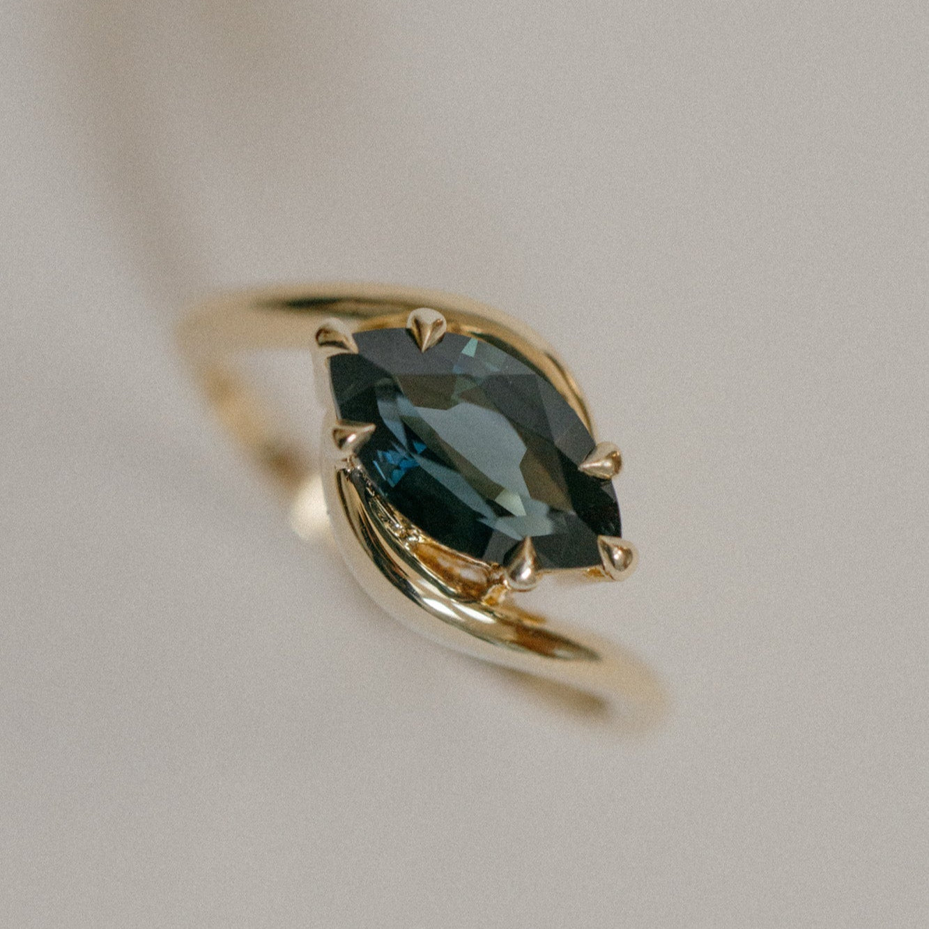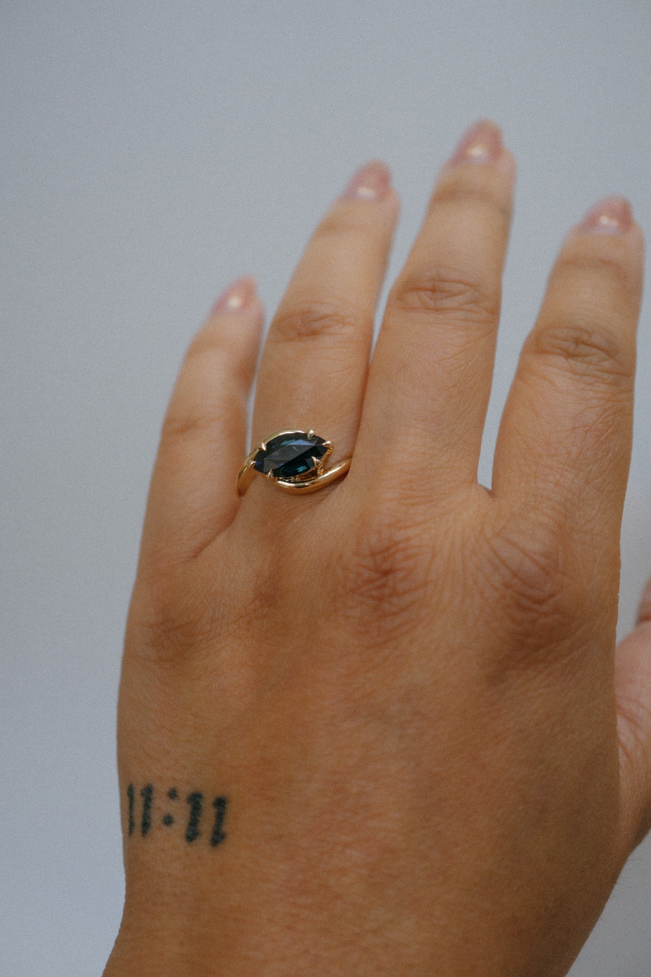 Goodness wrapped in love. The Nori ring highlights a one-of-a-kind natural teal marquise brilliant-cut Australian sapphire, embraced on either side by a bypass setting. Currently a size 7, but resizable--email us your size after you purchase it online. Only one and ready to ship!