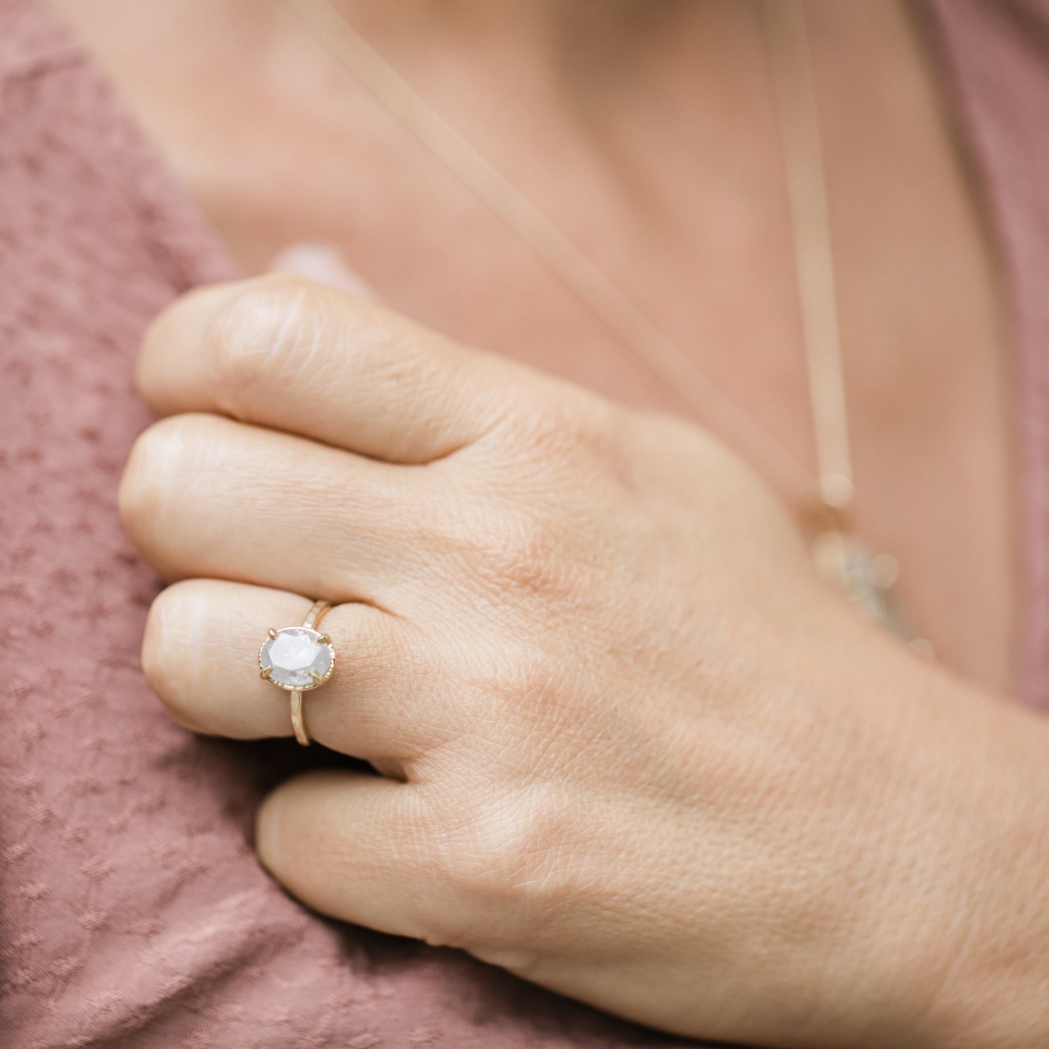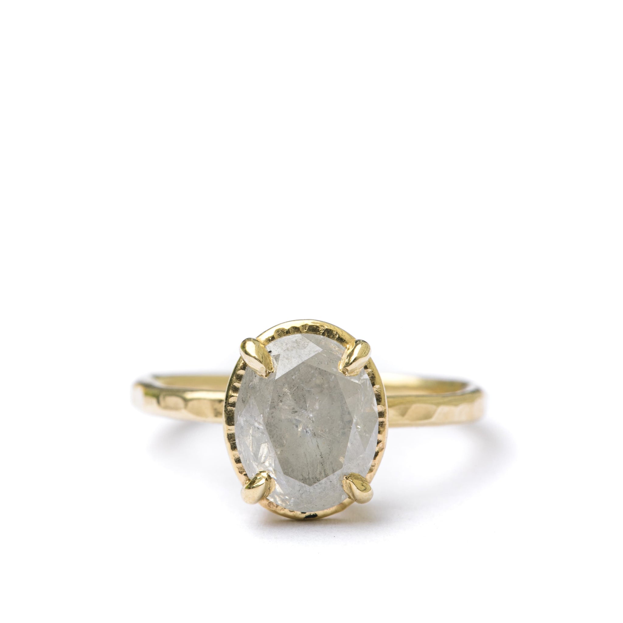In a hammered halo basket setting, the stone rests on a slender 1.5mm band of 14k yellow gold. Lightly hand-hammered, the warm gold shines, bouncing off the diamond's powdery glimmer.