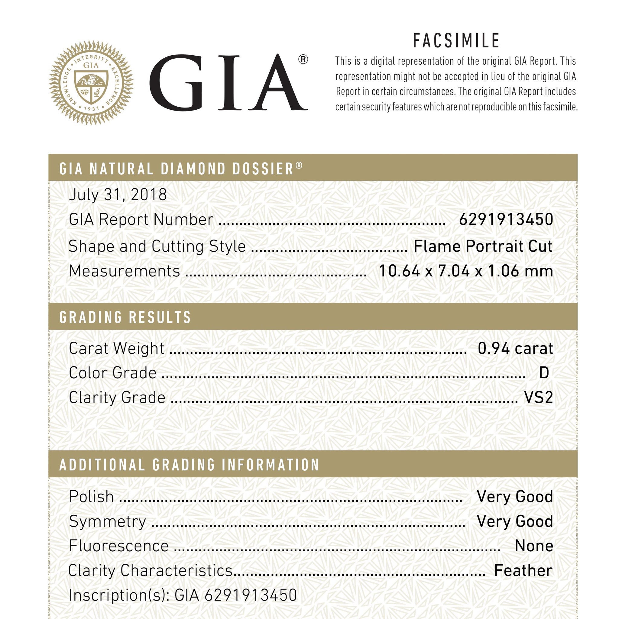 0.94ct 10.64x7.04x1.06mm GIA VS2 D Flame Portrait Cut 26745-01