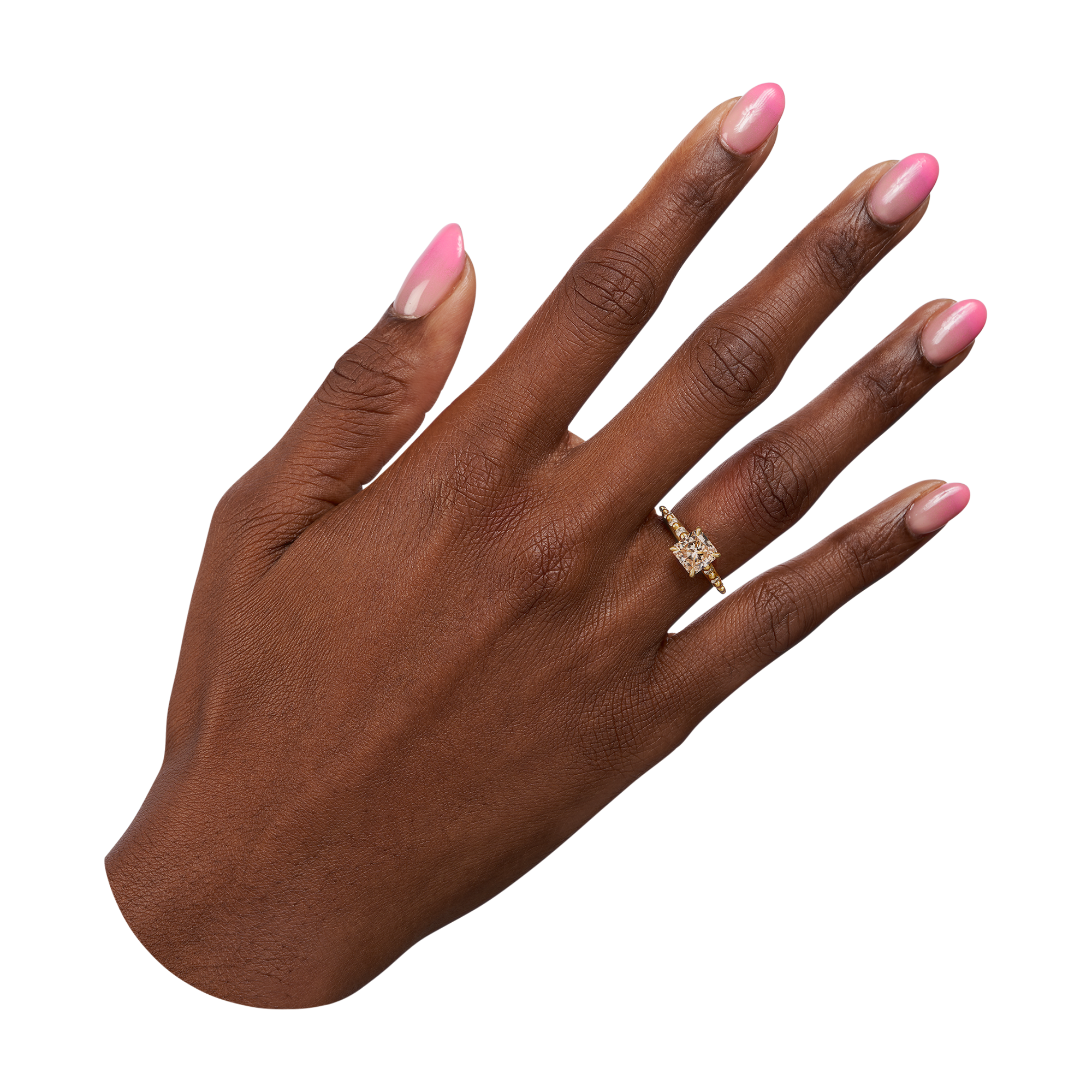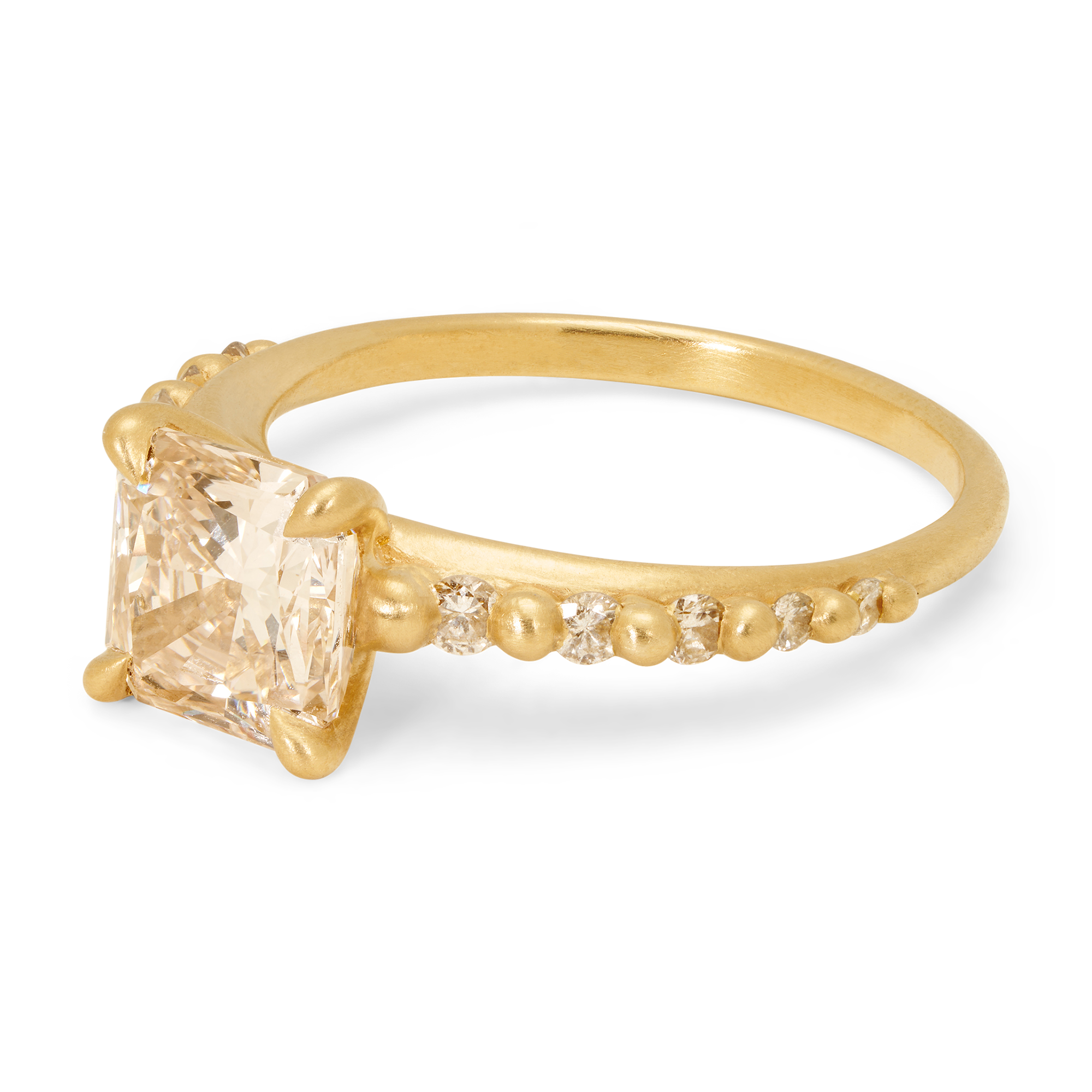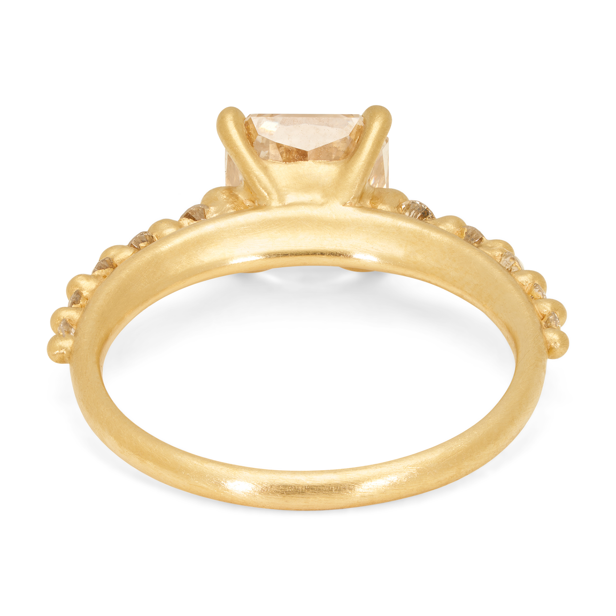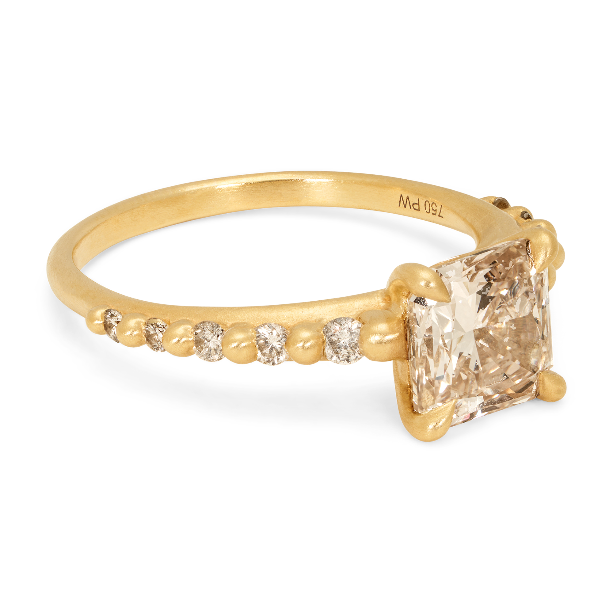 This one-of-a-kind 2.05ct VS2 clarity, C3 color cut-corner square brilliant champagne diamond from Misfit Diamonds is a Kimberley-compliant, mixed origin stone set on Polly Wales signature raised petal band with graduated champagne side stones in 18k recycled yellow gold.