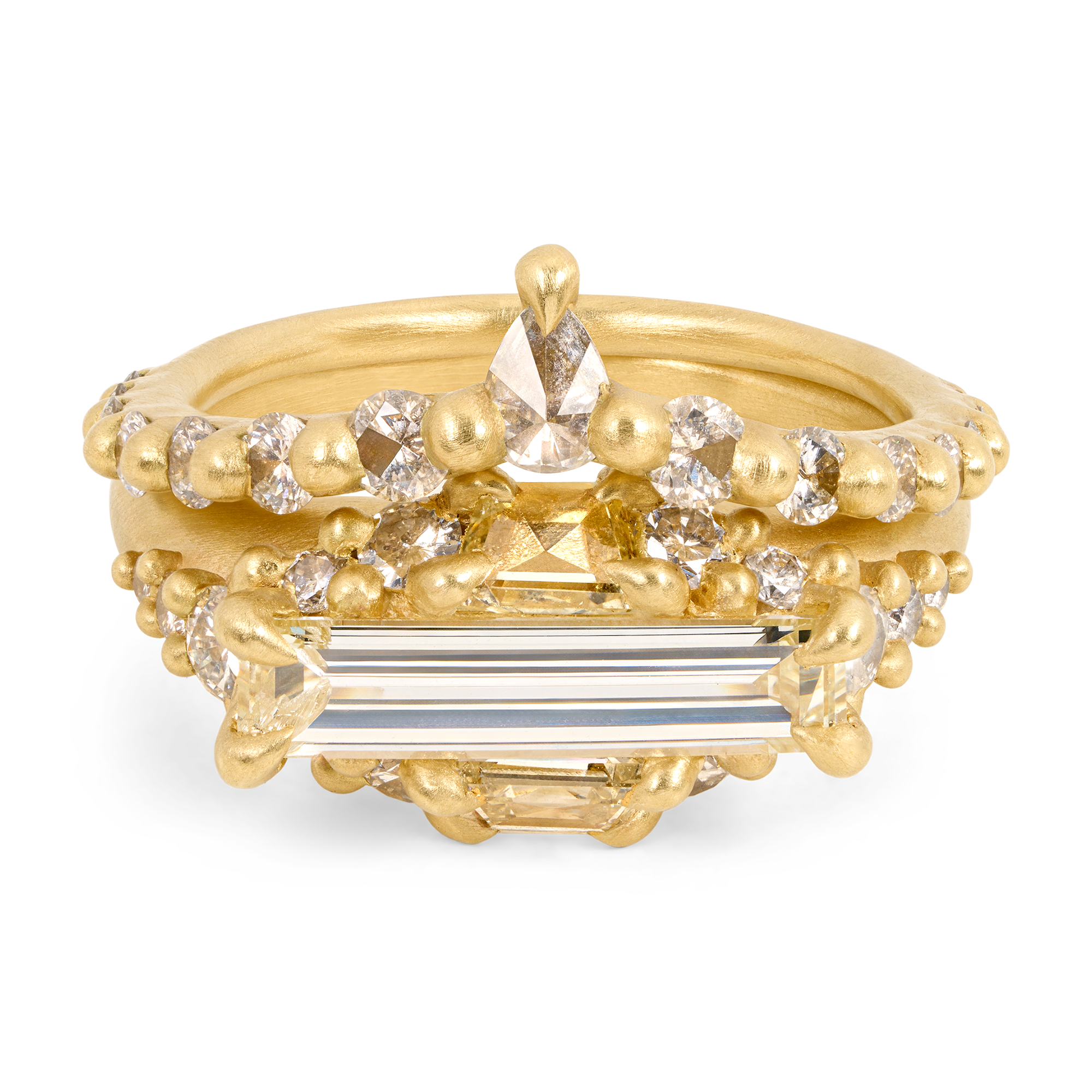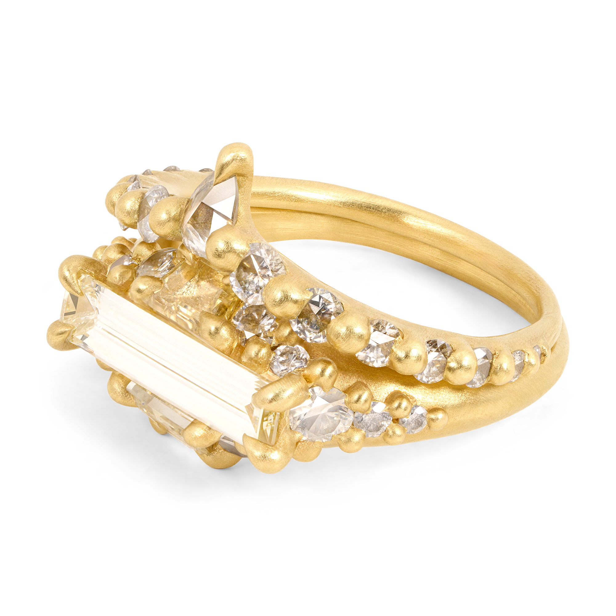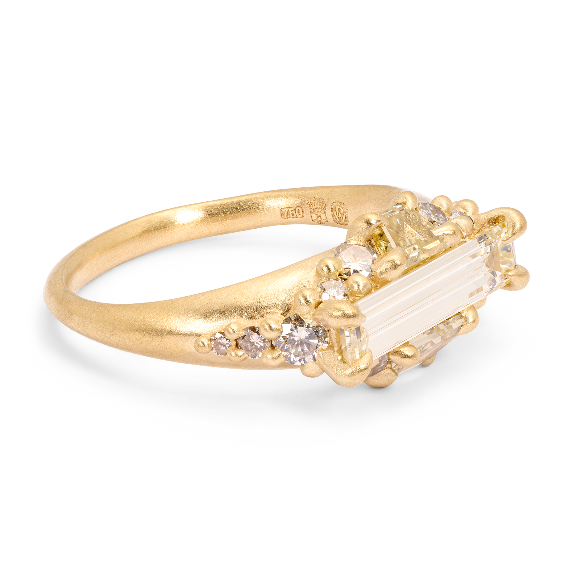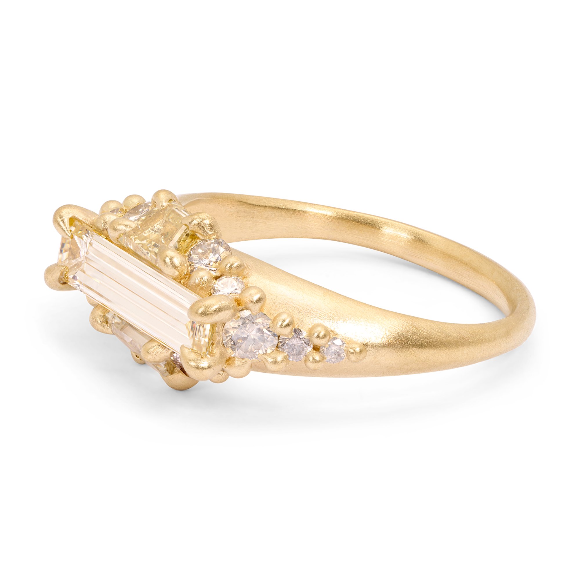 The center diamond is a one-of-a-kind, perfectly imperfect 0.92ct long step cut baguette from Misfit Diamonds. Yellow trapezoid and round white diamonds frame the center diamond atop a domed tapered band Cast-Not-Set in 18k recycled yellow gold.