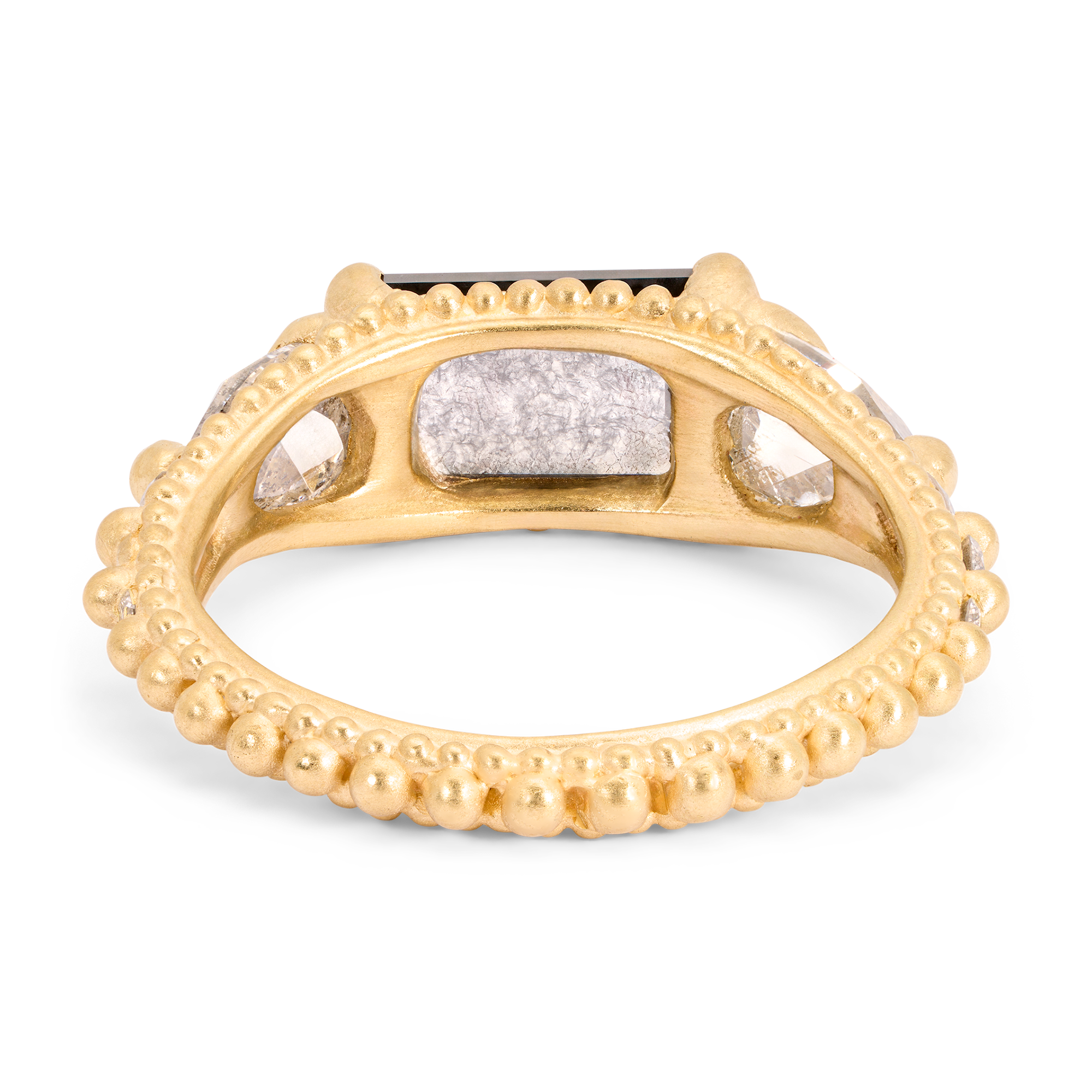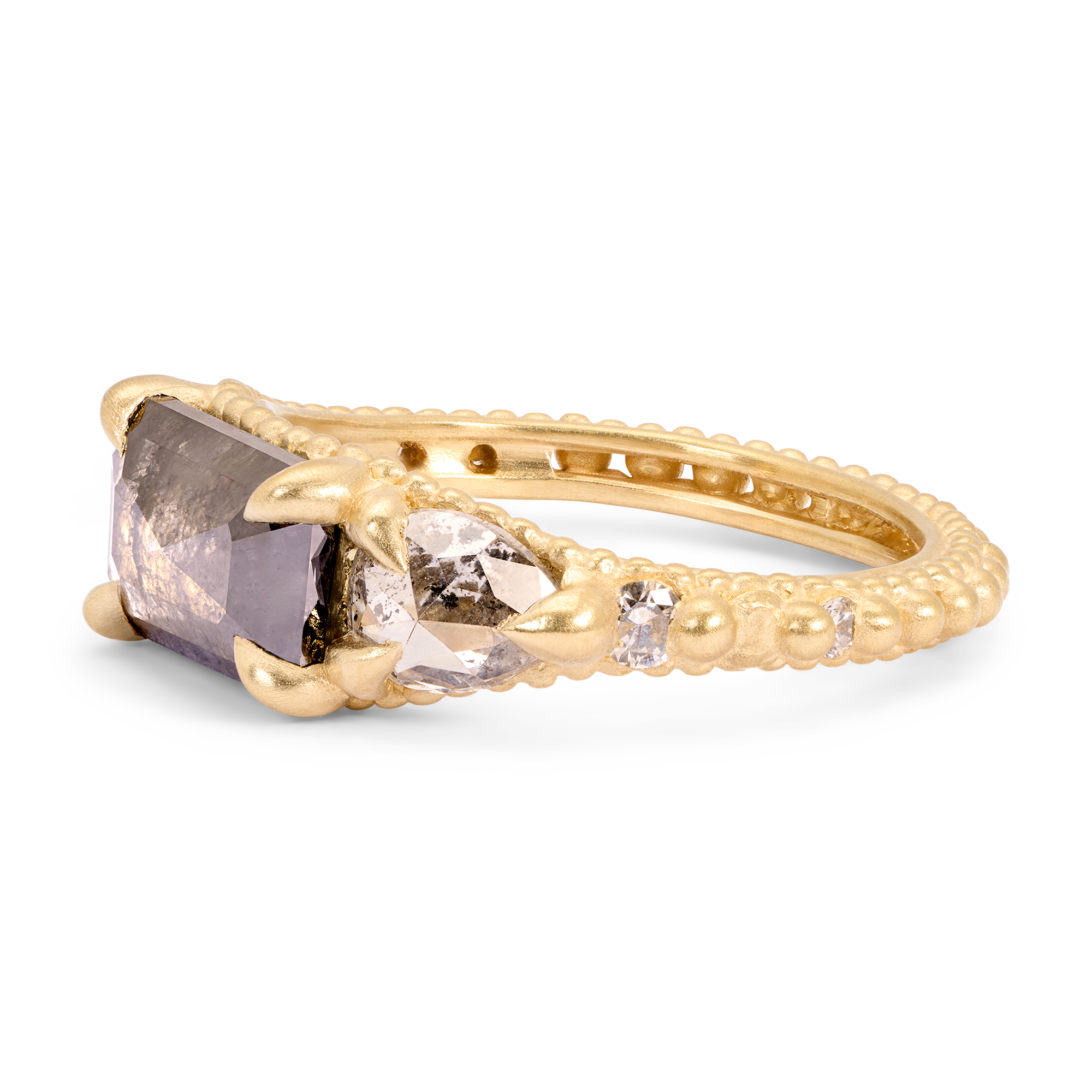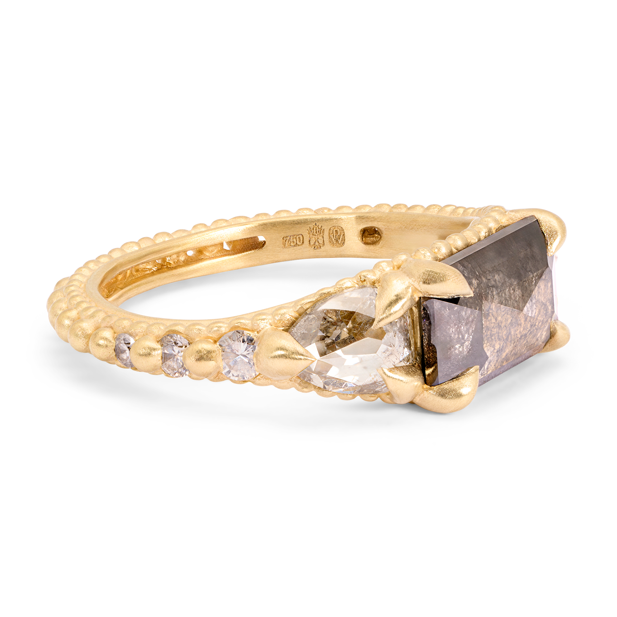 The center diamond is a one-of-a-kind, perfectly imperfect 2ct grey rectangle rose cut from Misfit Diamonds. Claw set pear shaped grey diamonds and round cloudy white diamonds flank the center diamond in a beaded rapunzel band Cast-Not-Set in 18k recycled yellow gold.
