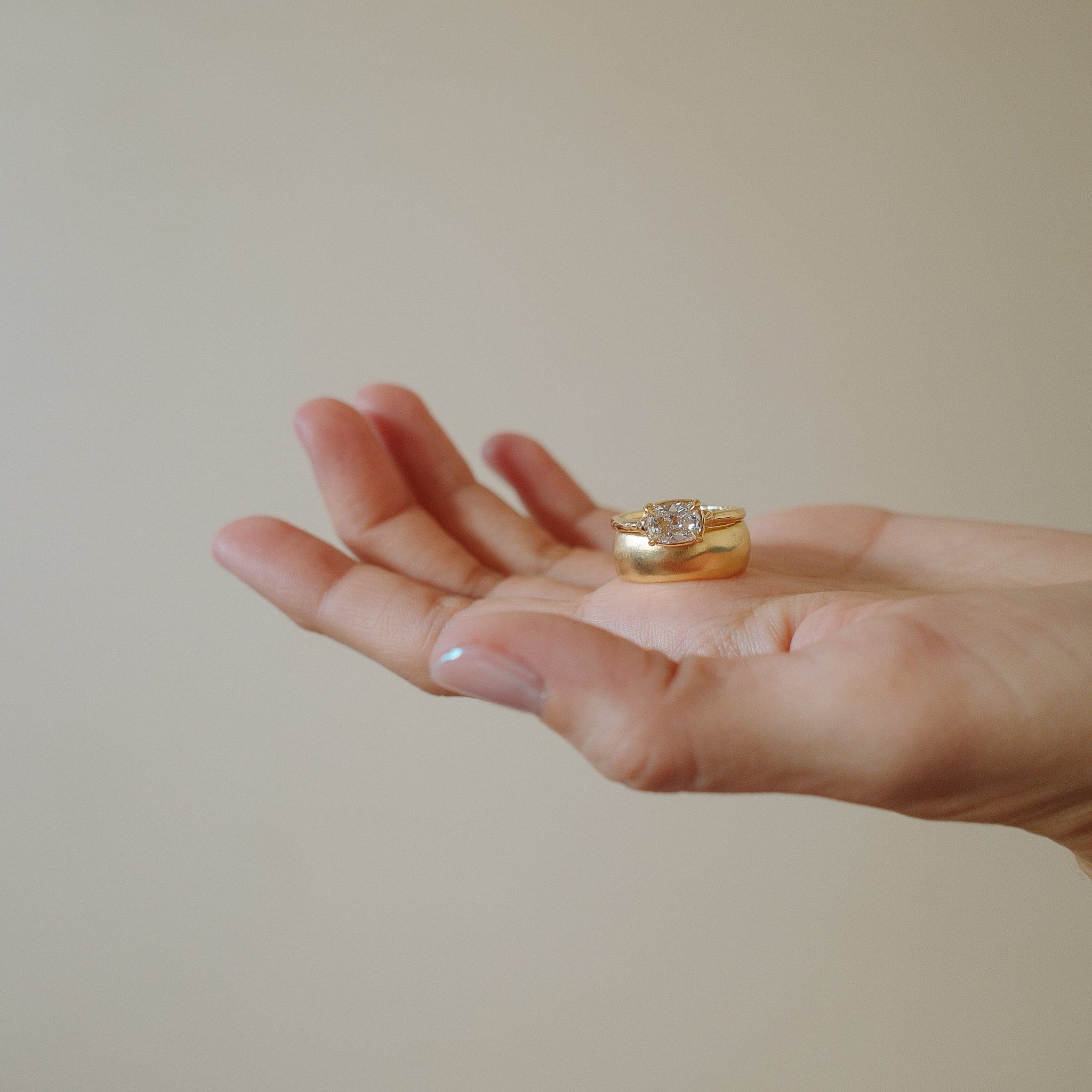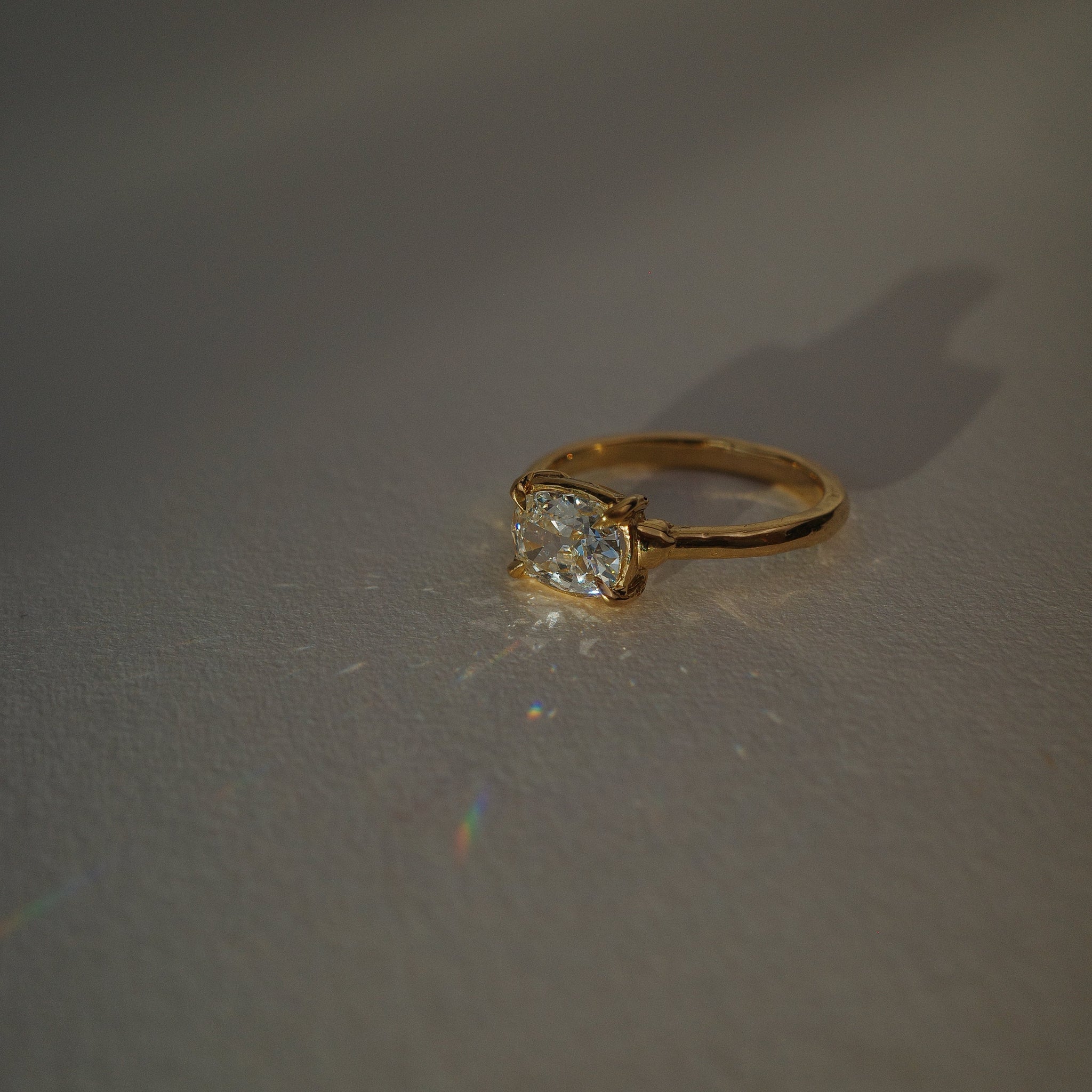 Large open facets of this modern antique old mine cut diamond ring create a pillowy softness to a very classic silhouette. Elegant, a little eccentric, overflowing with dreamy romance.  Up close, sculptural beads marry the band and basket where light swirls of textured gold dance across the surface. Very (under)statement.